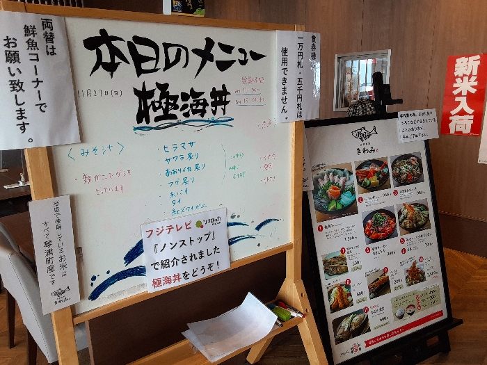 ワタクシ、魚に詳しくないので贅沢丼に盛られた魚が何か分かりませんが、本日のメニュー極海丼の内容は、ヒラマサ、サワラ炙り、あおりイカ炙り、フグ炙り、赤バイ、タイ、紅ズワイガニの中より4種類になることが紹介されていました。