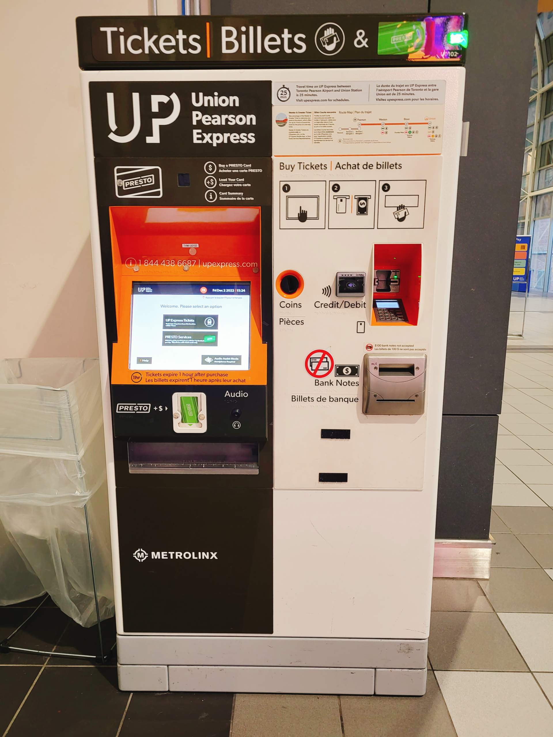 空港への特急電車 Union Pearson Express(通称UP Express)の券売機はユニオン駅からCNタワーに向かうコンコースにあります。