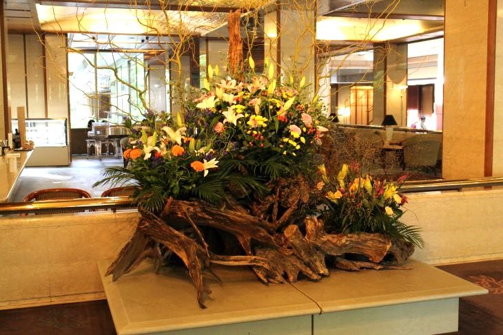 ロビー装花の奥がラウンジになっており、中庭を眺めながらジュースをいただきほっと一息。