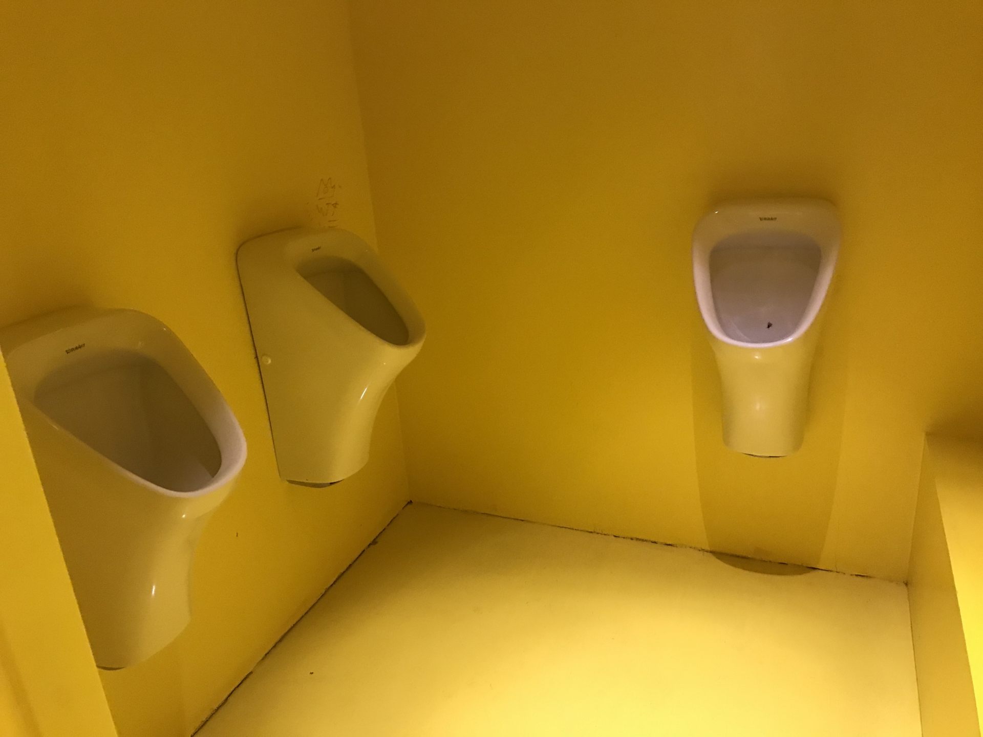 このトイレは劇場に併設されたレストランにあります。なんと個室トイレに男性用便器(あさがお)が3つあります。もちろん鍵付きです。個室ひとつにつき便器はひとつでいいんじゃ…なぜ3つ???(残りの全個室には当然のことながら個室ひとつにつき便器がひとつありました)。ちなみに先日も個室に便器がふたつ設置されたトイレを見かけました。なんなんでしょうか???