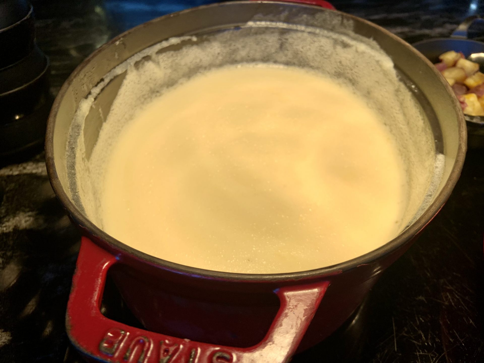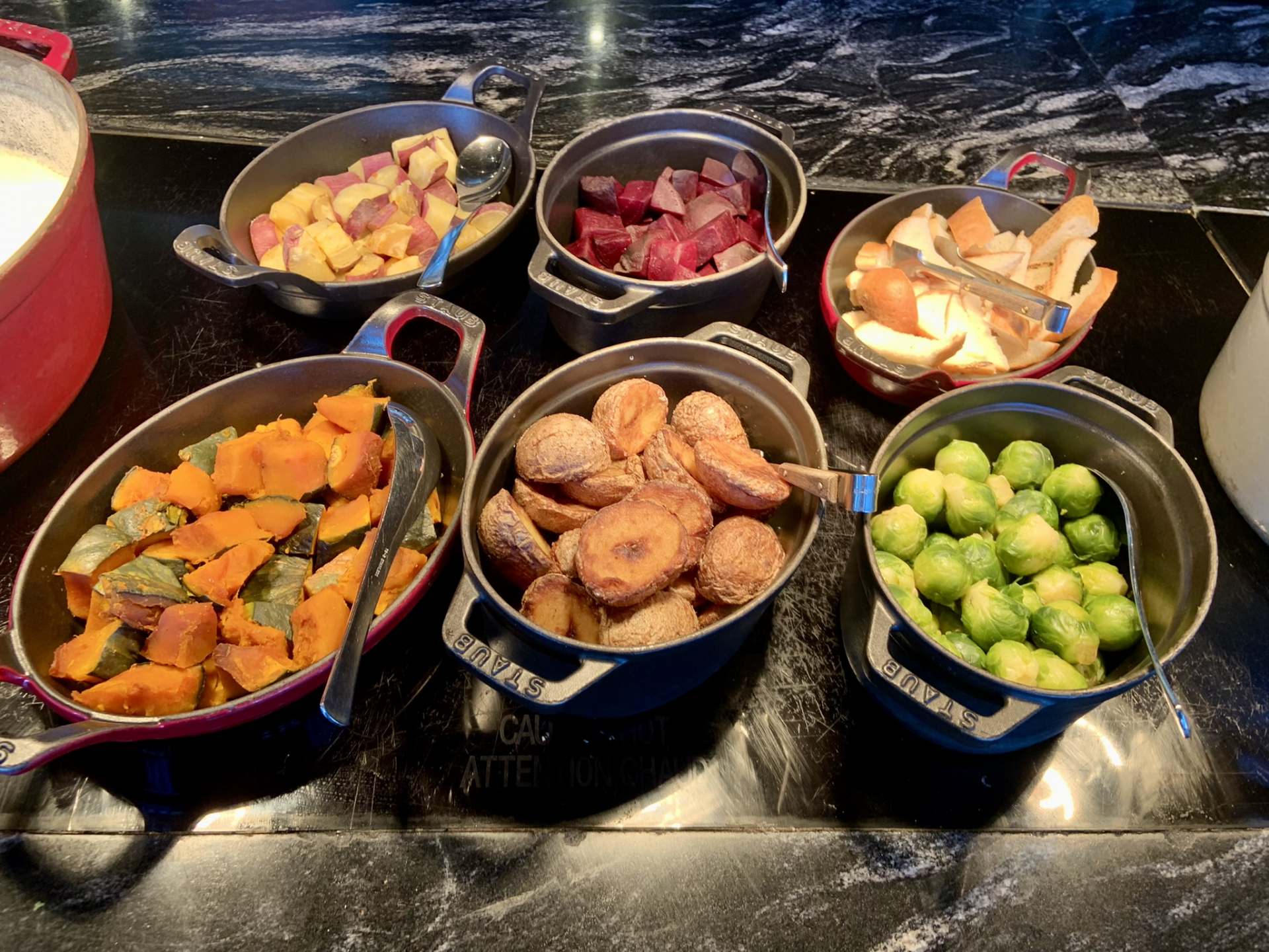 ・チーズフォンデユ、ガルニッシュ(ブレッド、ポテト、かぼちゃ、紫芋、芽キャベツ、ビーツ)