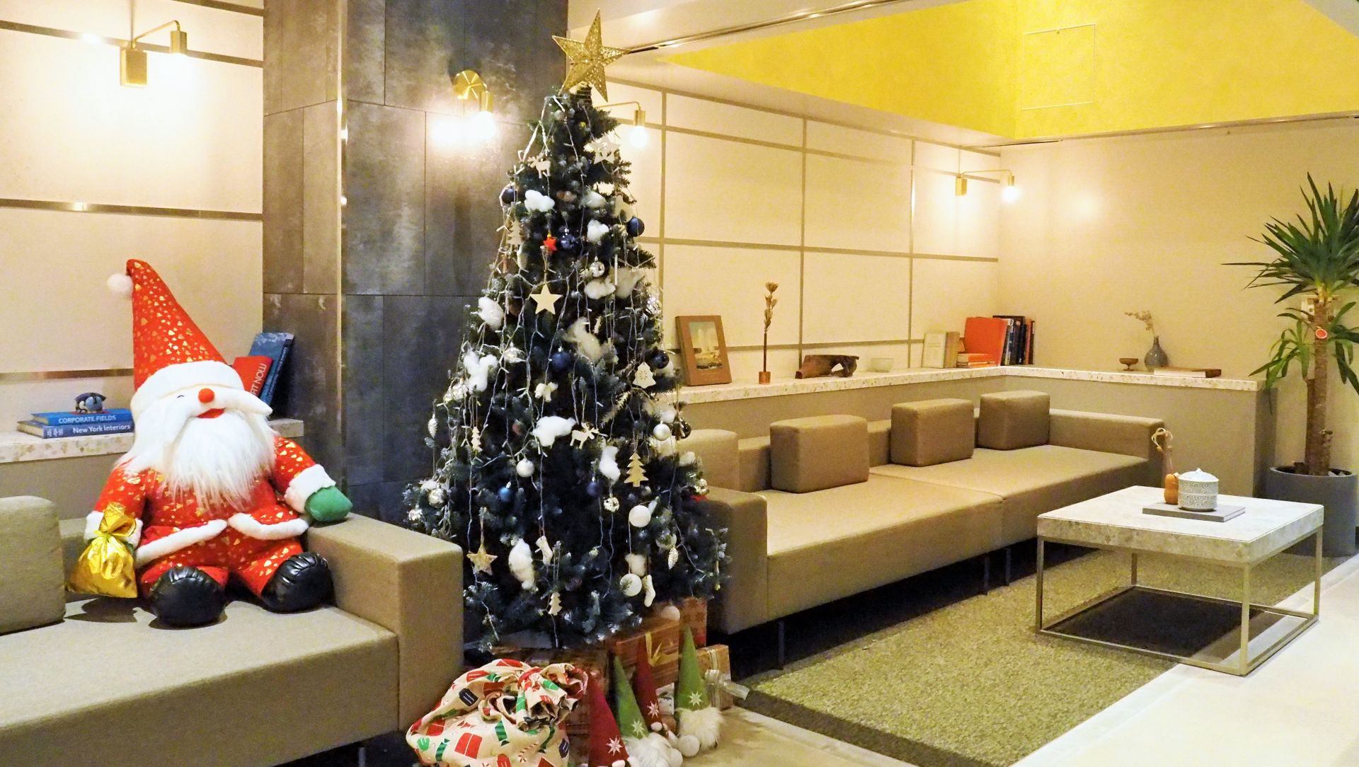 ロビーにはクリスマスツリーやサンタクロースが飾られ、温かなインテリアでした。写真には写っていませんが、ちょっとしたライブラリーが奥にあり観光パンフレットや金沢に関する本が置かれていました。