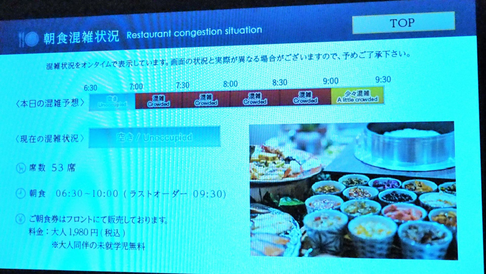 上の写真は朝食会場の混雑状況を示しています。他にも大浴場の混雑状況もわかり便利でした。