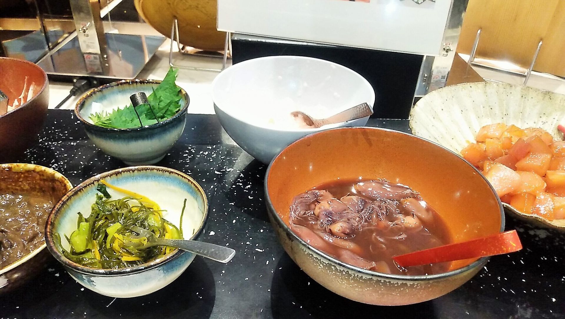 朝食のビュッフェでは、金沢の郷土料理が色々と食べられます。サラダバーでは金時の草などの加賀野菜もありました。ドレッシングは風味豊かな加賀棒茶を使ったものをかけています。加賀棒茶のドレッシングなんて意外ですが、香ばしいかおりと共に美味しくいただきました。