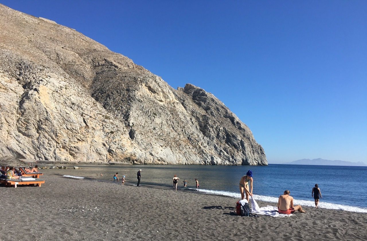ギリシャ(サントリーニ島)のビーチでゆっくり地中海を満喫しようとフィラ(関連記事)からバス(大人片道€2.2)に1時間半(停車駅が多く、帰りは30分ほどだった)揺られてペリッサ(Perissa)という町にたどり着きました。