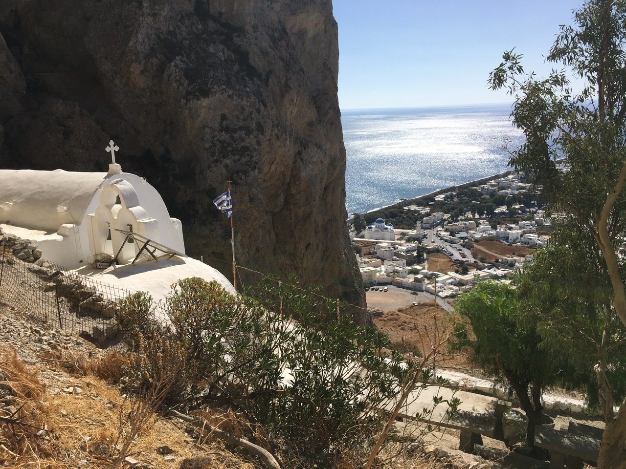 息を切らせながらようやくたどり着いたのは、「Panagia Katefiani」という小さな教会でした。メサヴノ(Mesa Vouno)山、標高200mの巨大な岩に立つこの礼拝堂はその昔、戦禍や海賊から逃れるための避難所だったそうです(参照:“Santorini Panagia Katefiani”Greeka, 2022.)。たしかに、ここまで来たら安心できそうです。