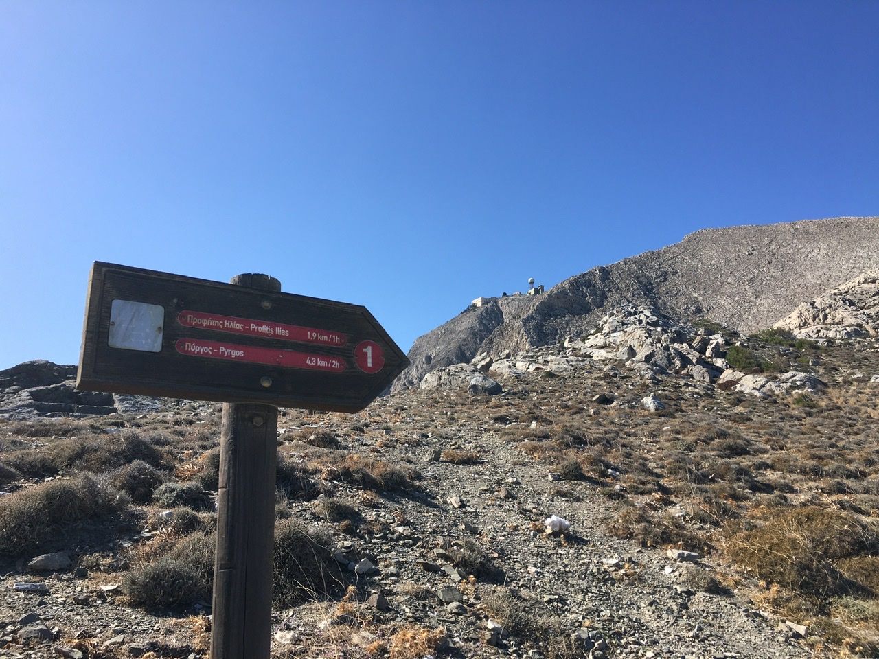 半信半疑でそのまま突き進むと、「古代ティラ遺跡(Ancient Thira)」という看板が現れました。ちょうど降りてきた人に尋ねると、教会まで20分ほどだろうというので、軽い気持ちで登り始めました。