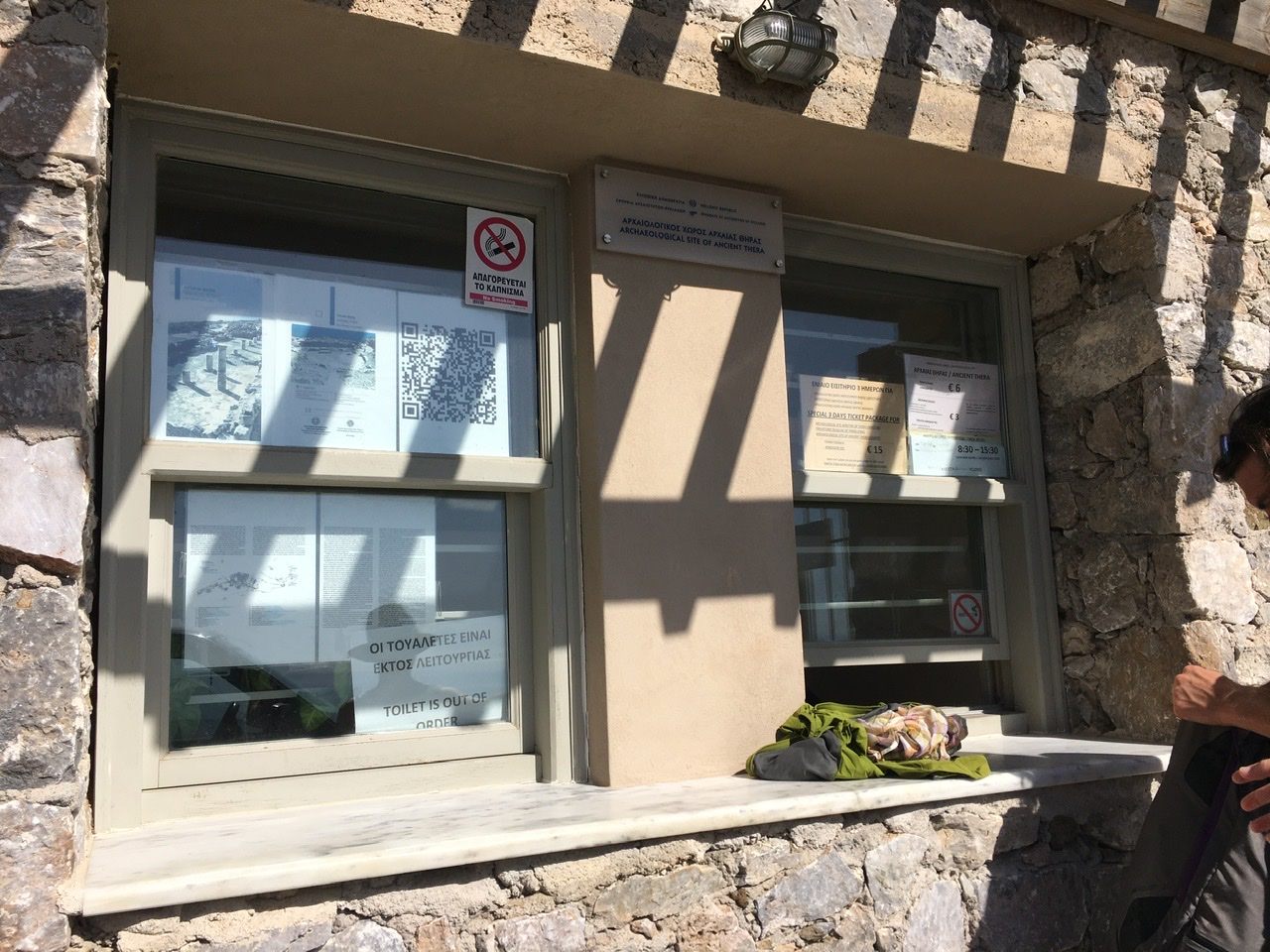 いよいよ絶望感に襲われた頃、またひとり女性が降りて来ました。藁にもすがる思いで「あとどれくらいか」と聞くと、遺跡まではこの道よりさらに険しいこと、彼女のスニーカーでも厳しかったので、私の登山用ではないショートブーツではとても耐えきれないであろうことから、じきに現れる博物館(Archaeological Site of Ancient Thera)までで止めておくべきだという貴重なアドバイスを受けました。