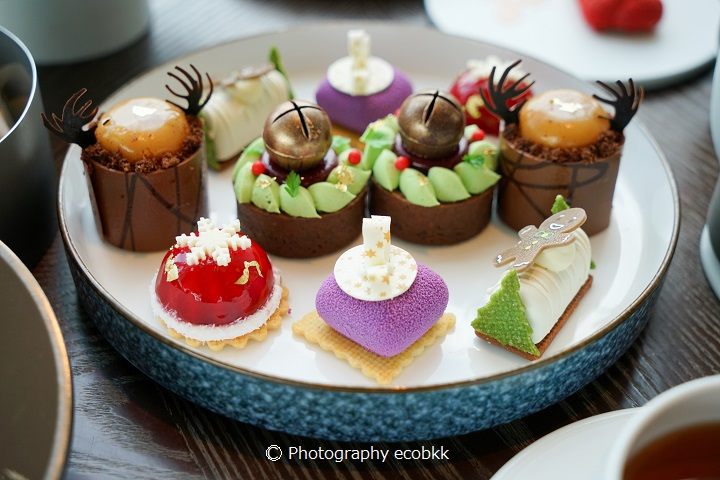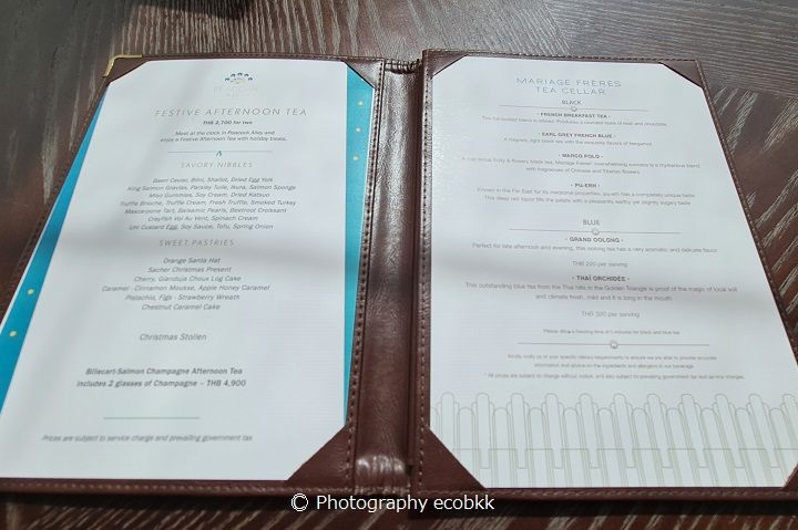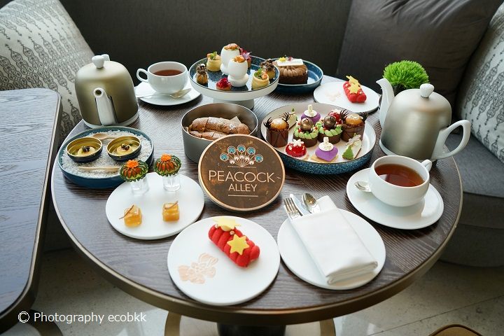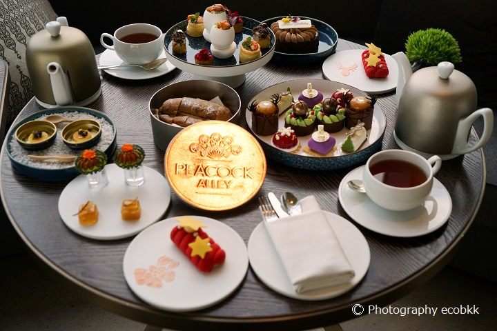 今回ご紹介するピーコックアレーのフェスティブアフタヌーンティーは、12月1日(木)から2023年1月1日(日)まで、午後1時~5時の時間帯で提供されます。アフタヌーンティーの内容は以下にリンクしたメニューページをご覧ください。今回頂いたのは、2人用2700バーツ(税サービス代別)のフェスティブアフタヌーンティー(Festive Afternoon Tea)のセットですが、シャンパン付きのアフタヌーンティー(4900バーツ、税サービス代別)も選べます。