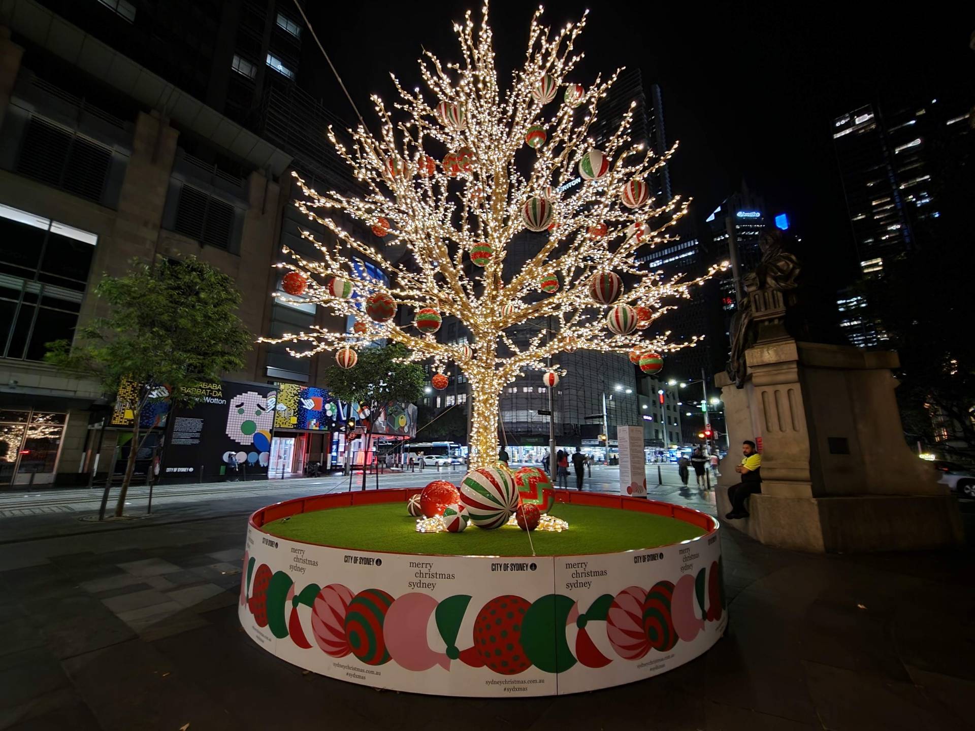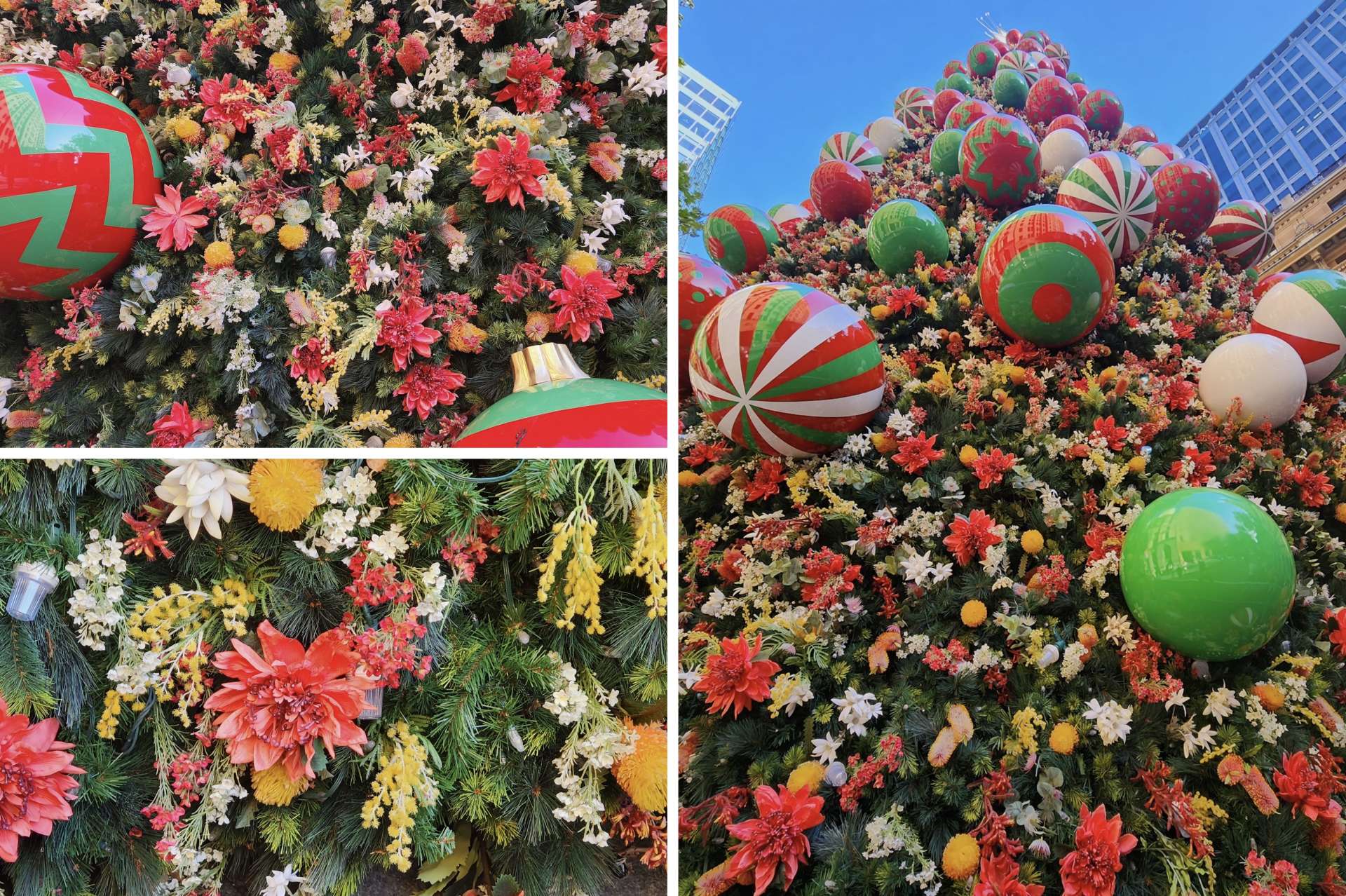 800本の枝には、330個のボーブル (丸いボール) や1万5千個のオーストラリア原産の花が飾られ、午後7時からは11万個以上のLEDライトが輝きます。1月1日までです。