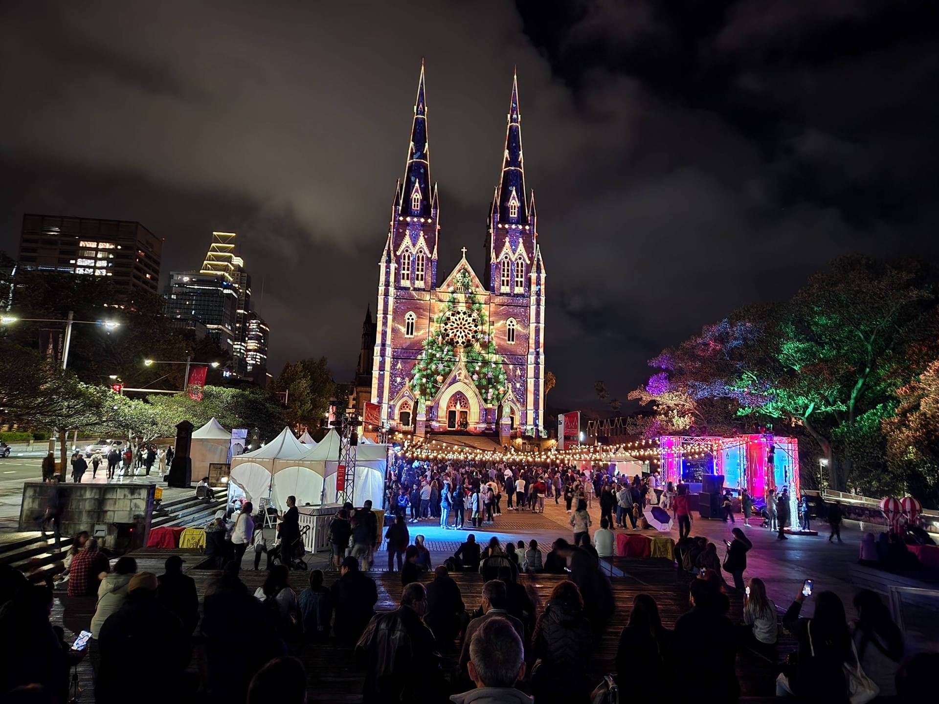 セント・メリーズ大聖堂 (St Mary’s Cathedral) のライトアップは、午後7時から12月25日まで行われています。今年は屋台が出たり、クリスマスキャロルなどのイベントが開催されたりと賑やかです。