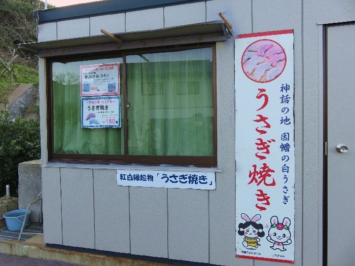 「白兎神社」鳥居前にある「うさぎ焼き」この日は、残念ながら開店していませんでしたが白うさぎ、赤うさぎと縁起物カラーリングのモチモチ食感のうさぎ焼きに出会えたらラッキーだぁで! また、「白兎神社」近くにある道の駅 神話の里白うさぎにも神話因幡の白うさぎにちなんだお土産を取り扱っていますのでチェケラください。