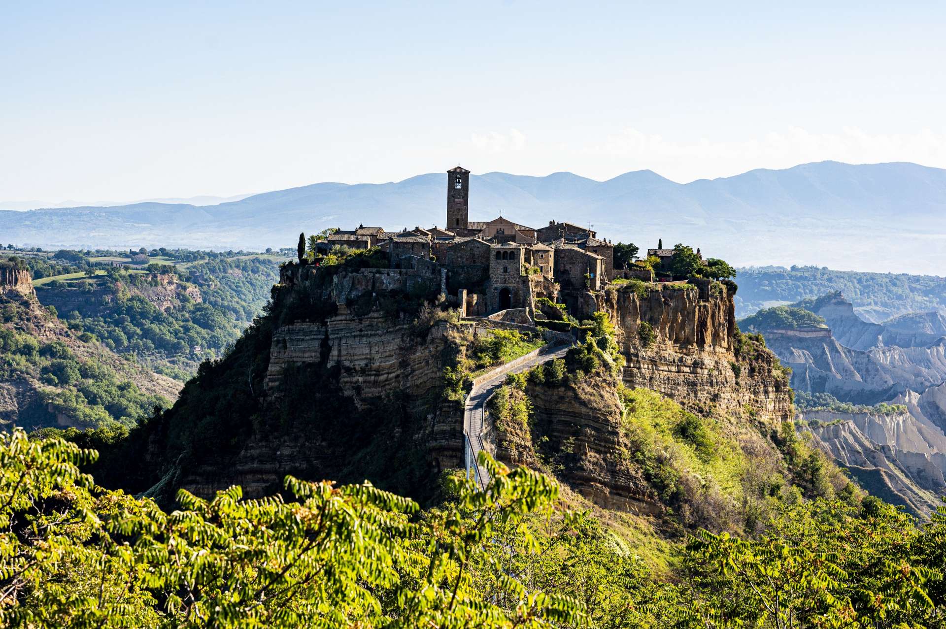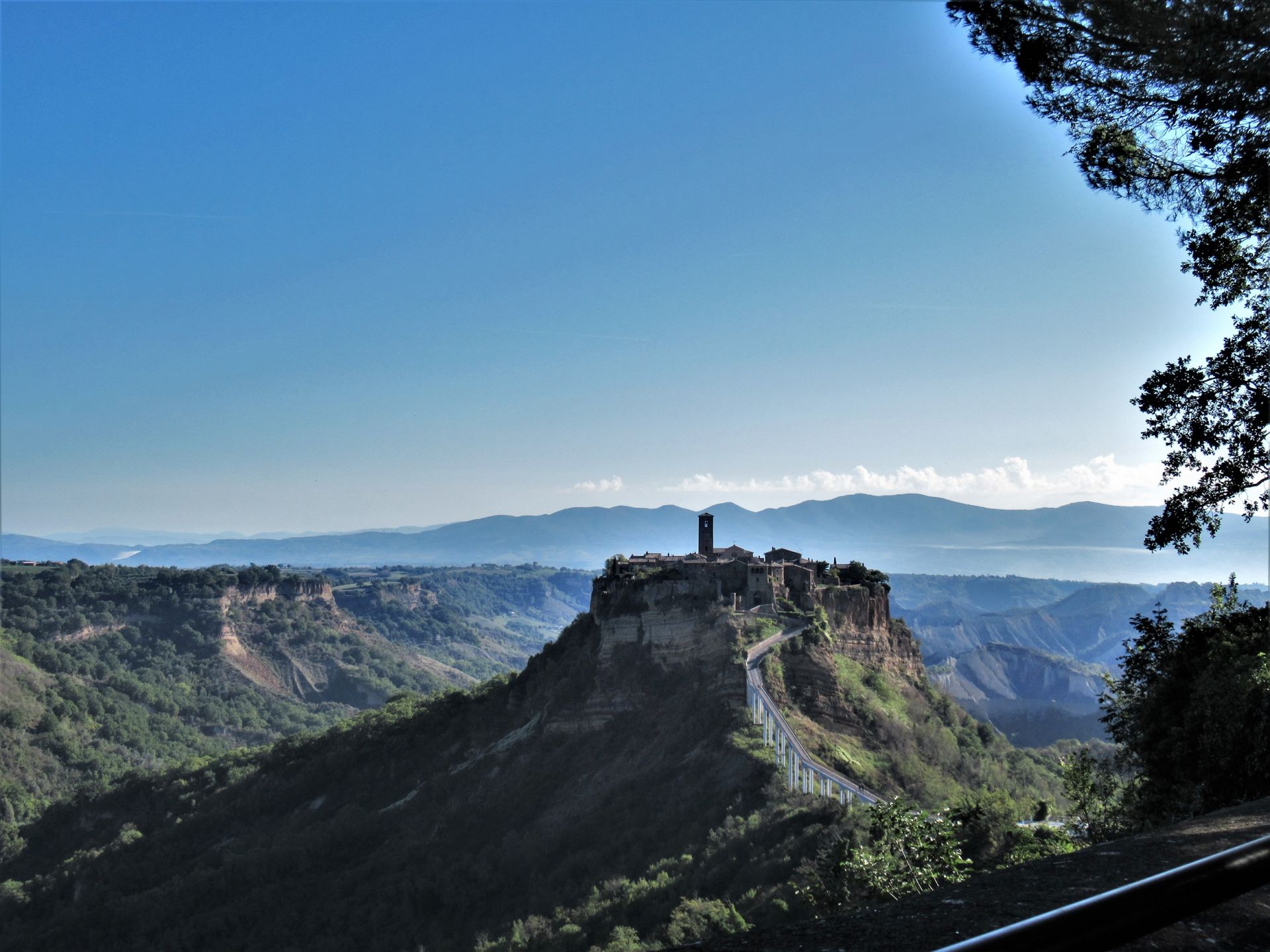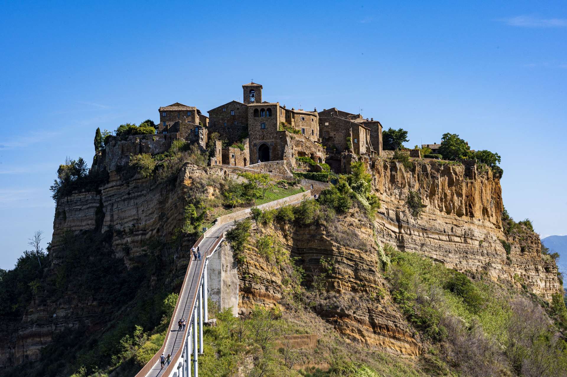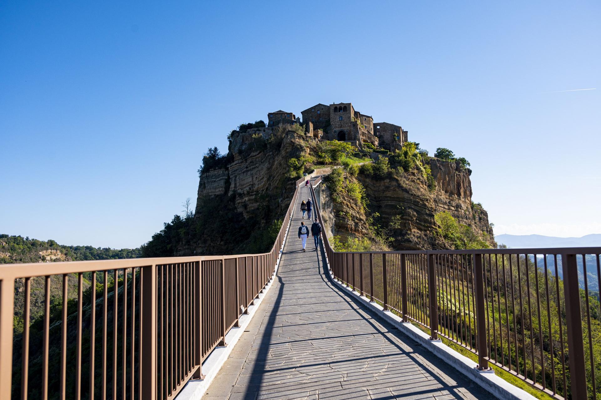 周辺は土壌がもろく崩れやすいトゥーフォ(凝灰岩)でできていて、かつての道を一筋だけ残し、地震や雨、風によりチヴィタの周囲は崩れ去ってしまったそうです。人口も、少ないときには10人を切ったとか。