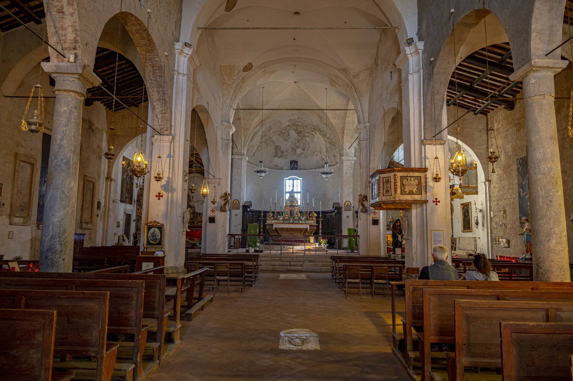 「サン・ドナート教会」は、5世紀にロマネスク様式で建てられたのが起源といわれていて、時代ごとに改築され、ロマネスク様式とルネッサンス様式が入り混じった建築物。さあ、なかに入ってみましょう。