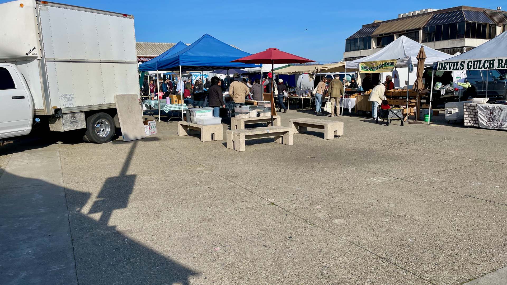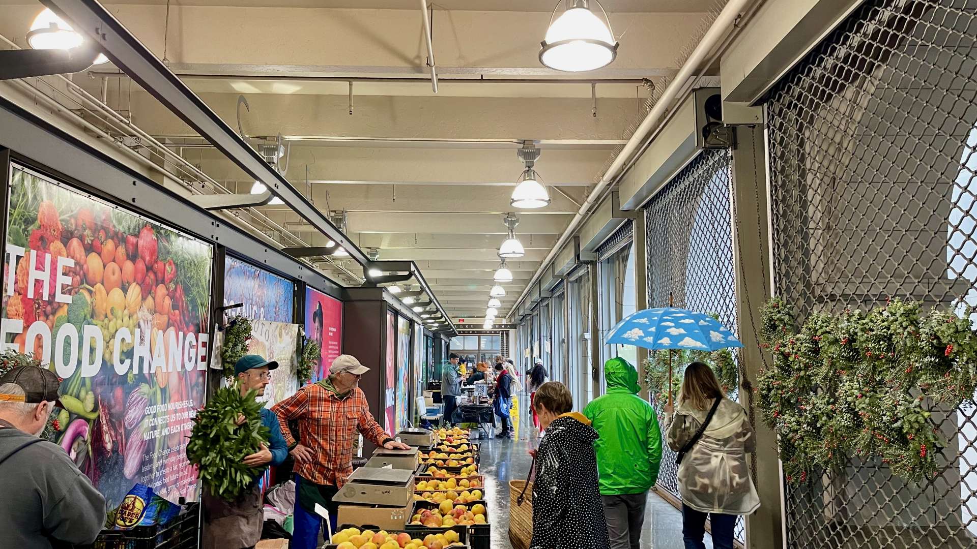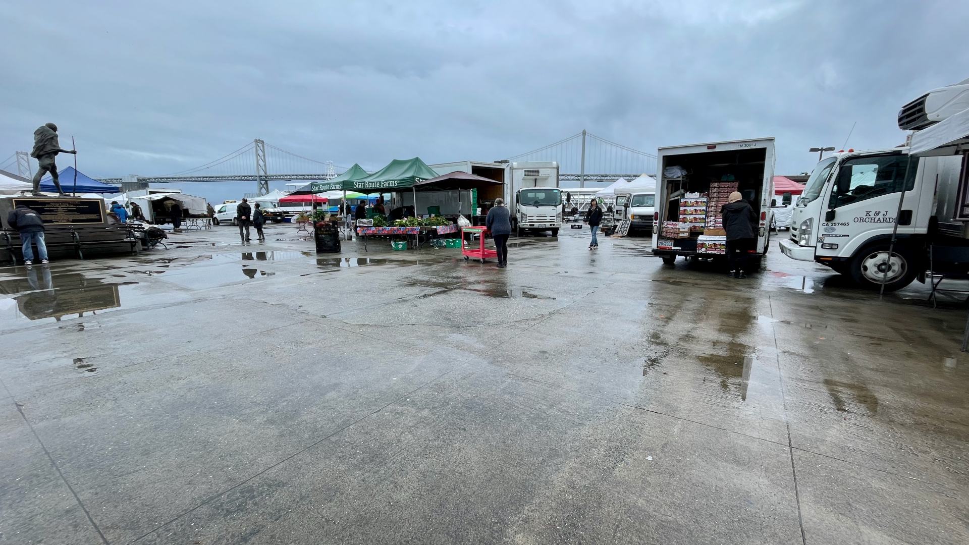 今年もいよいよ押し迫ってきましたね。毎週土曜日に開催されているフェリープラザのファーマーズマーケットの様子からサンフランシスコはどうなのか紹介してきましたが、本年最後の月になりました。今月は天気に恵まれず、嵐の予報的中の第二週目のマーケットは、ご覧のとおり出店していたブースは3割ほど、運営スタッフもびっくりしていました。