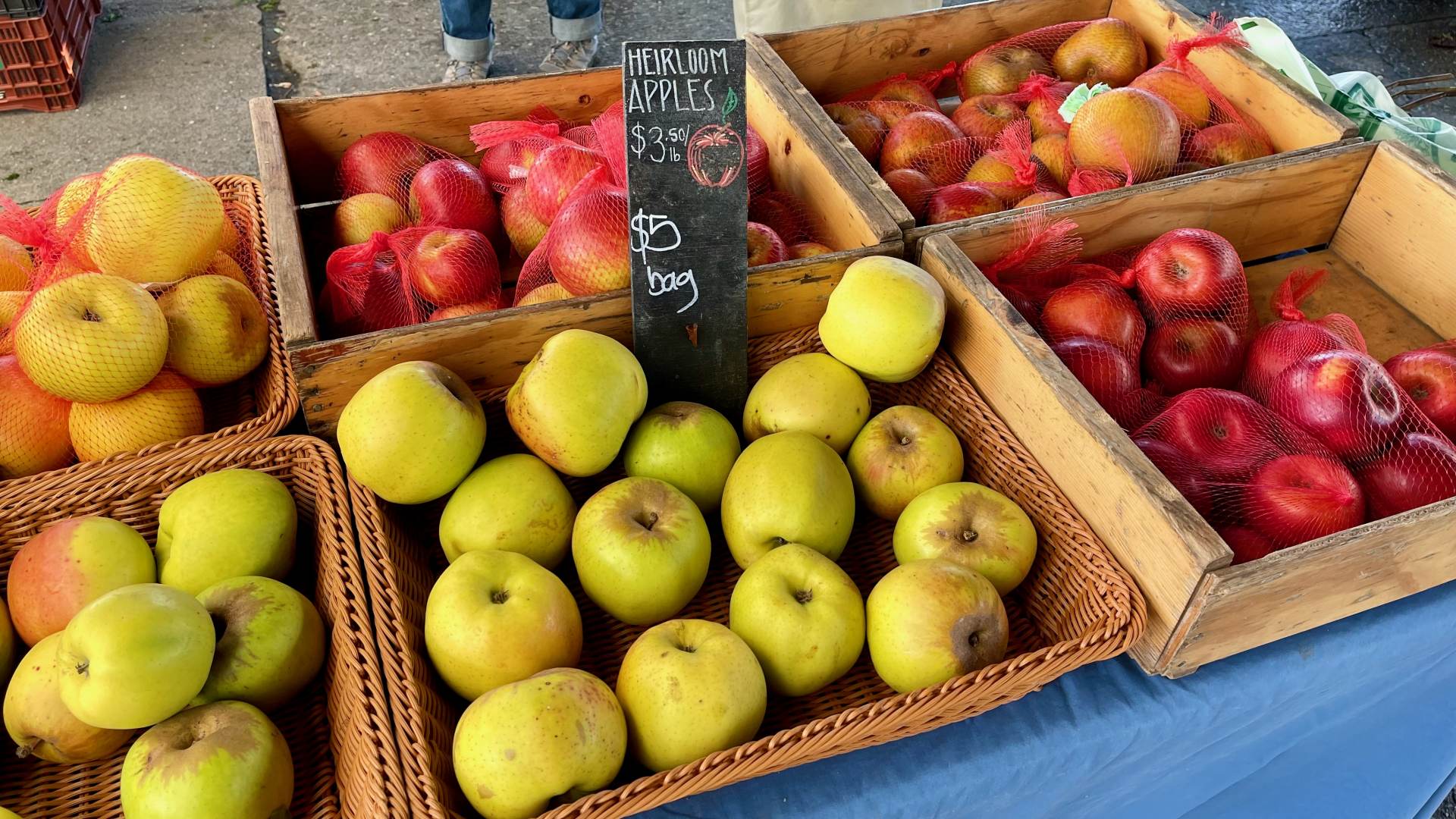 さて、『フィフス・クロウ・ファーム』ではエアルーム品種のりんごが並んでいました。右の赤いのがエンタープライズ、左側はファーマーさんイチオシの”ムツ”です。クリスピーで柔らかな酸味が特徴で、フェリービルのマーケットでここしか売られていません。日本のフジ(Fuji)りんごはとても有名になりましたが、ムツもどんどん市場に出て欲しいですね。頑張れ日本の美味しい食材!