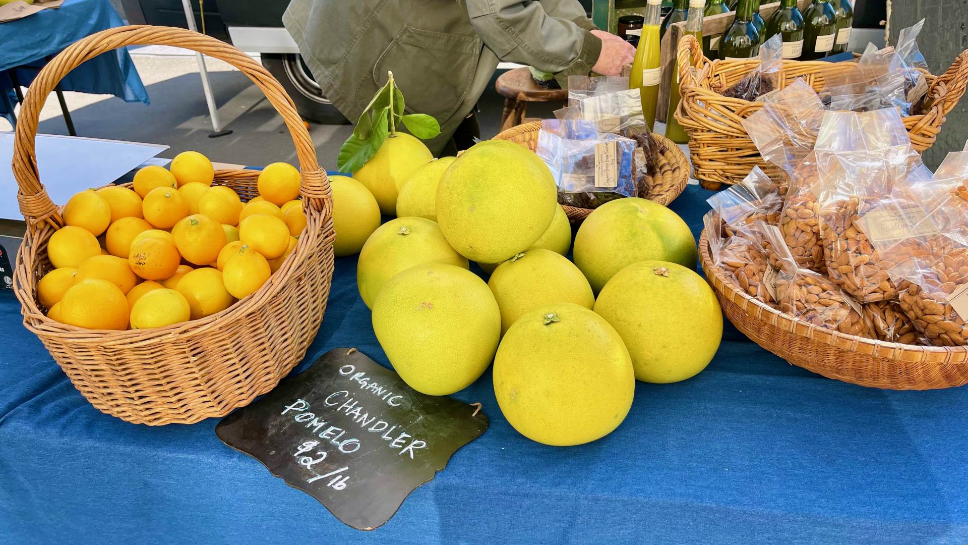 第3週目のマーケットは、チャンドラー・ポメロが登場しました。日本だと”ザボン”と呼ばれていて、これから春先まで出回ります。この日は10個くらいの少量でしたが、初物なので一番重いのを選んでもらって買ってみました。2lbちょっとだったので、4ドル