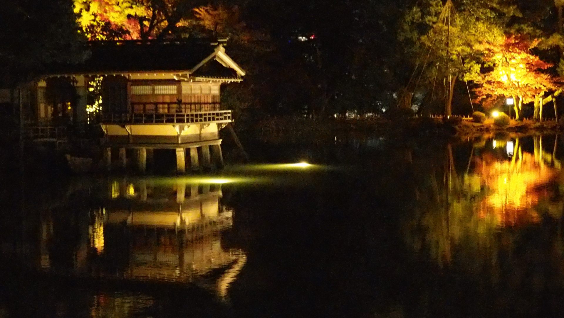 霞ヶ池に写り込んだ木々のライトアップが幽玄な雰囲気です。内橋亭がまるで水面に浮かんでいるようですね。