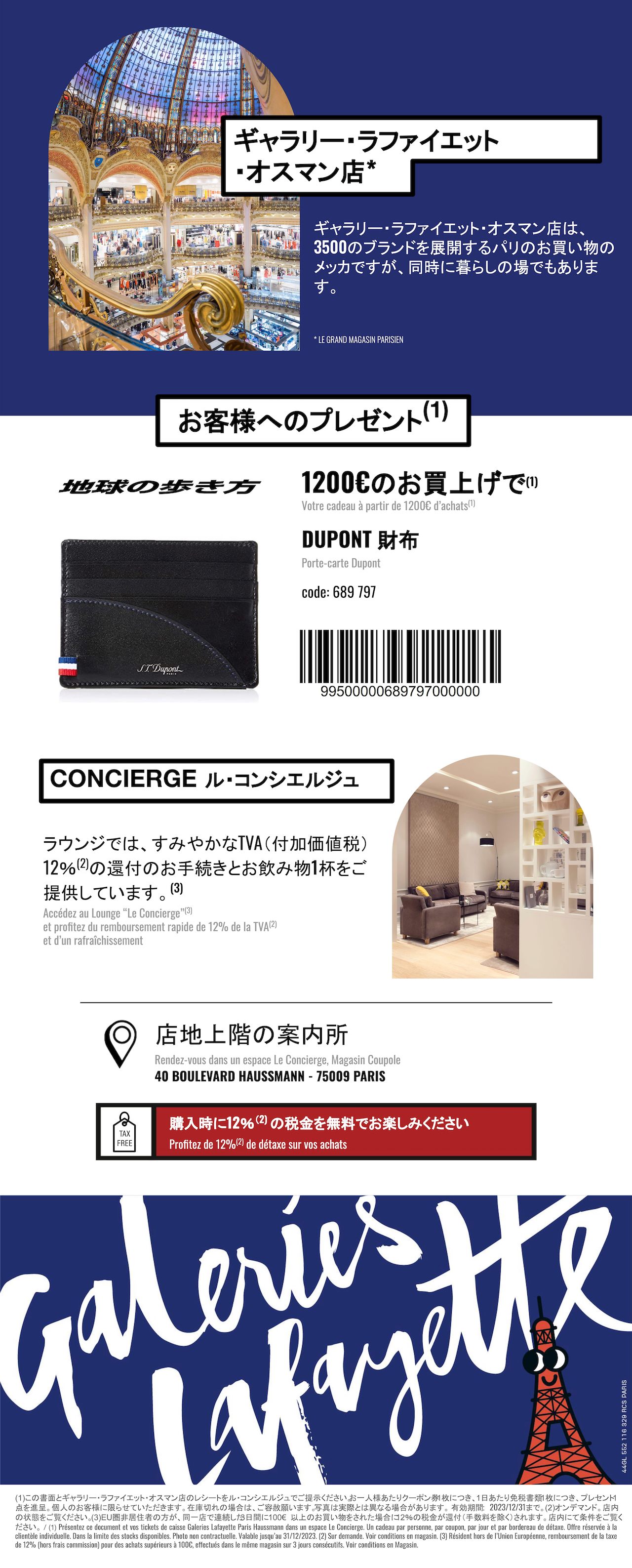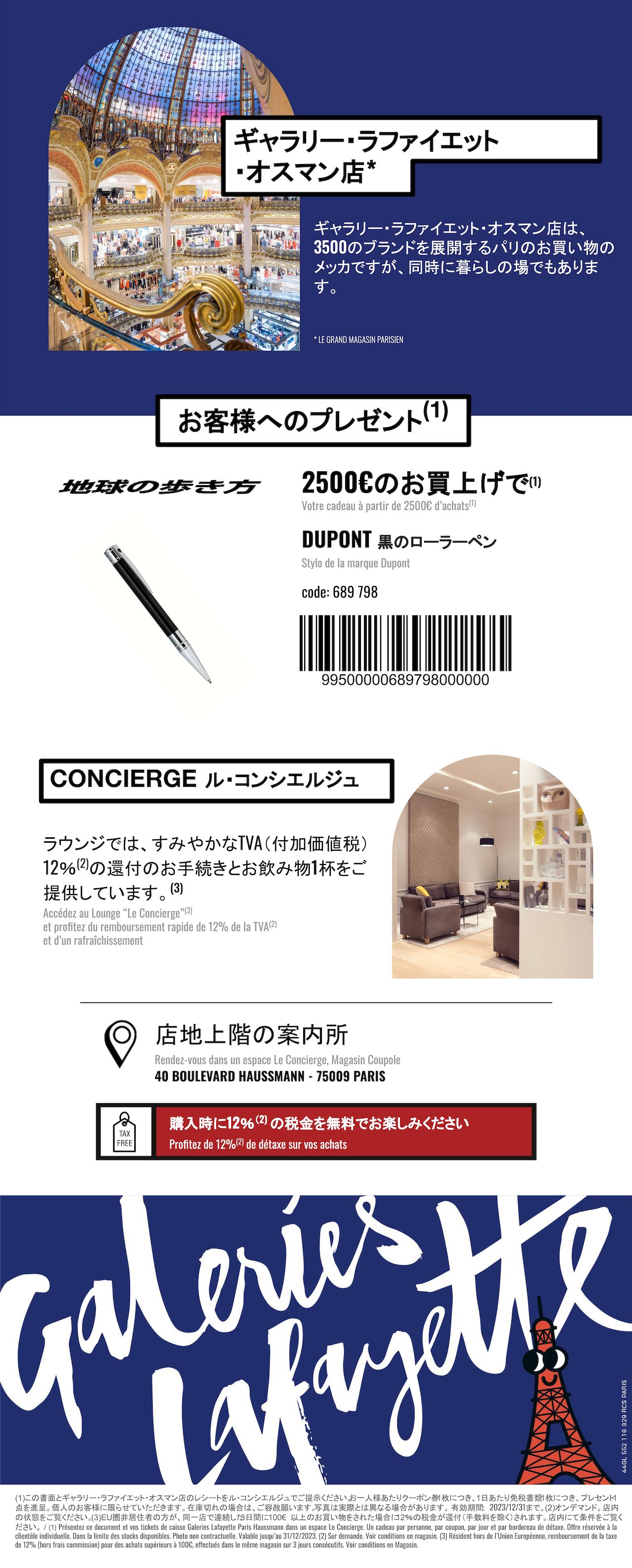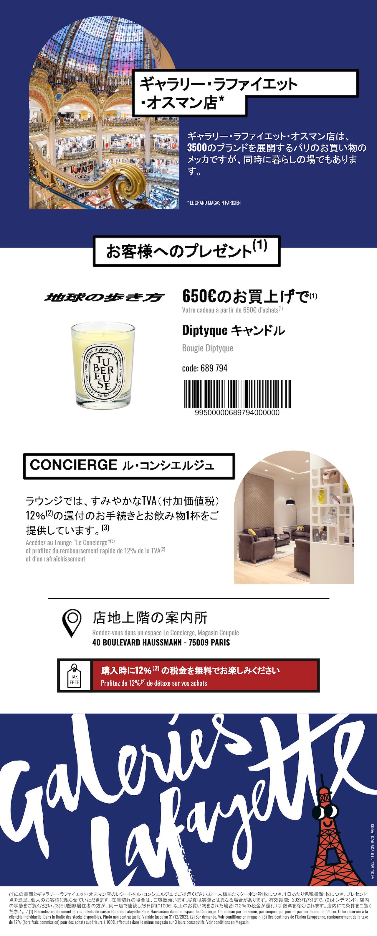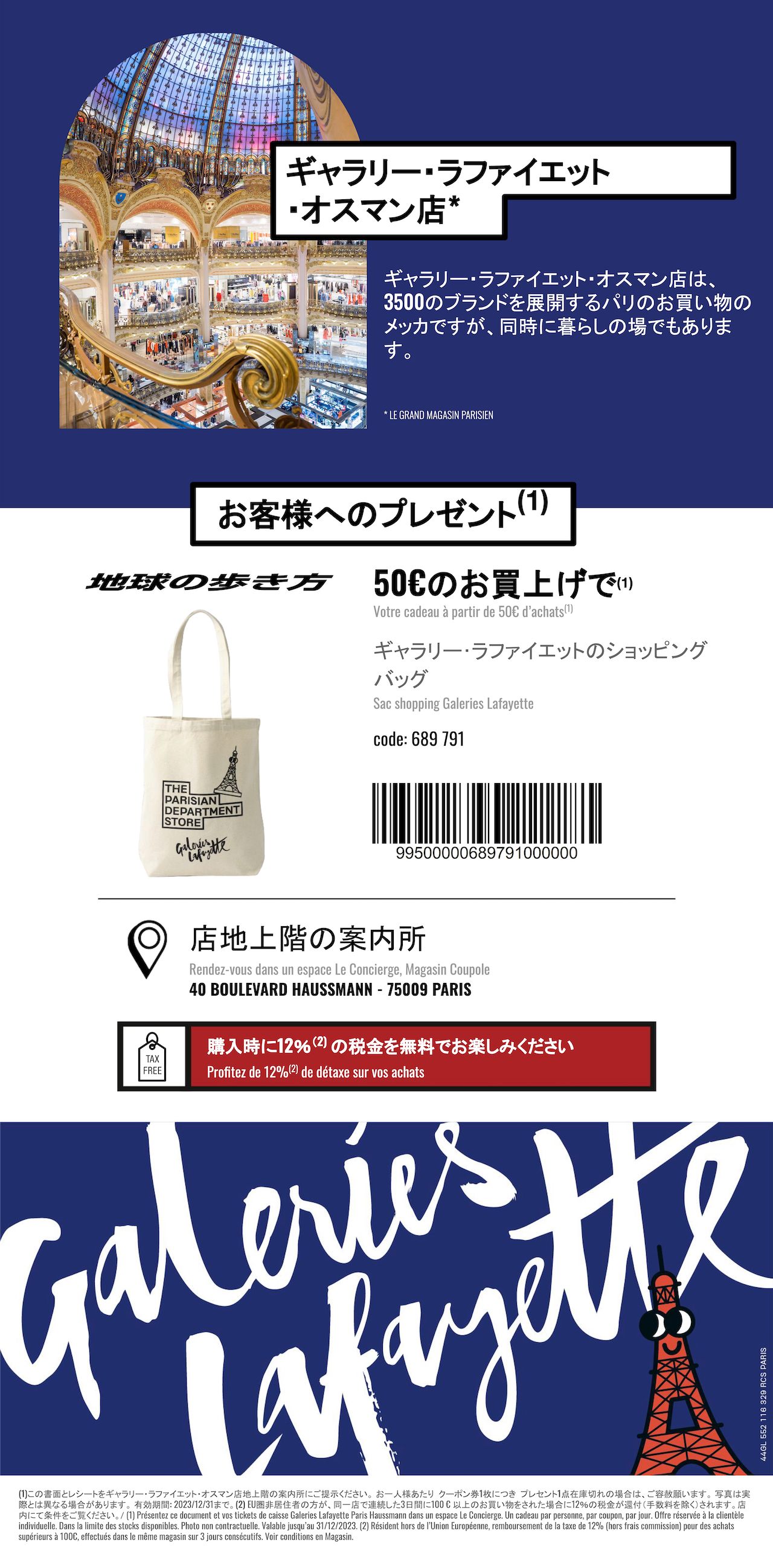 数年前からパリの百貨店ギャラリー・ラファイエット・パリ・オスマンと地球の歩き方がコラボレーションして発行している、ショッピング金額に応じてオリジナル商品や有名ブランドの特別なプレゼントがもれなくもらえるクーポンが、今年もできました。