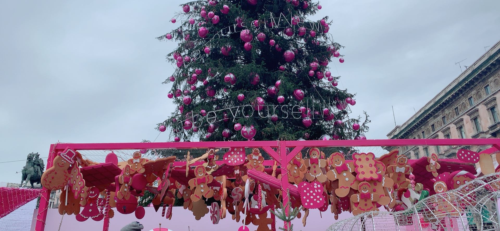 今年のドゥオモ広場のクリスマスツリーはピンク色。
