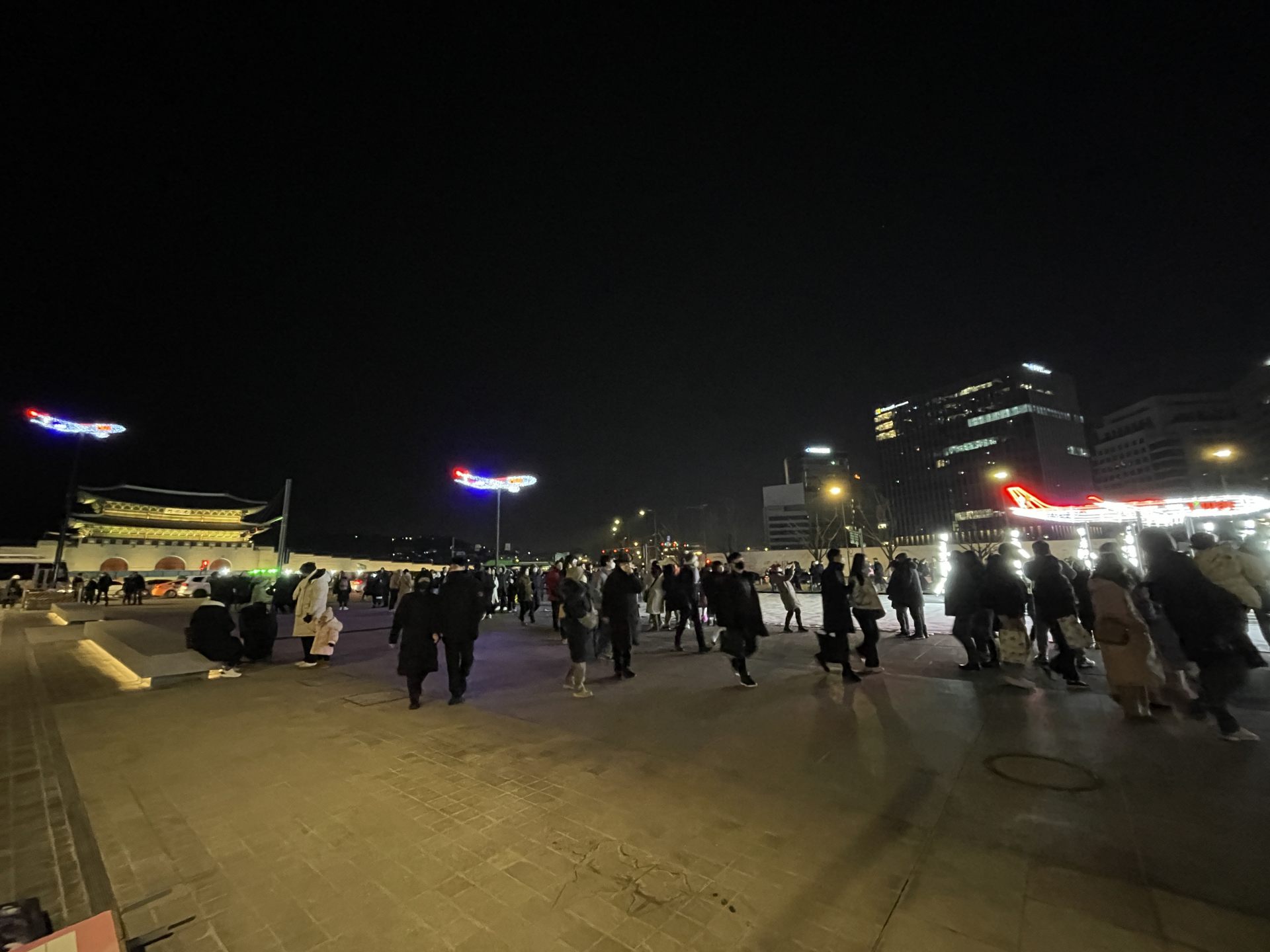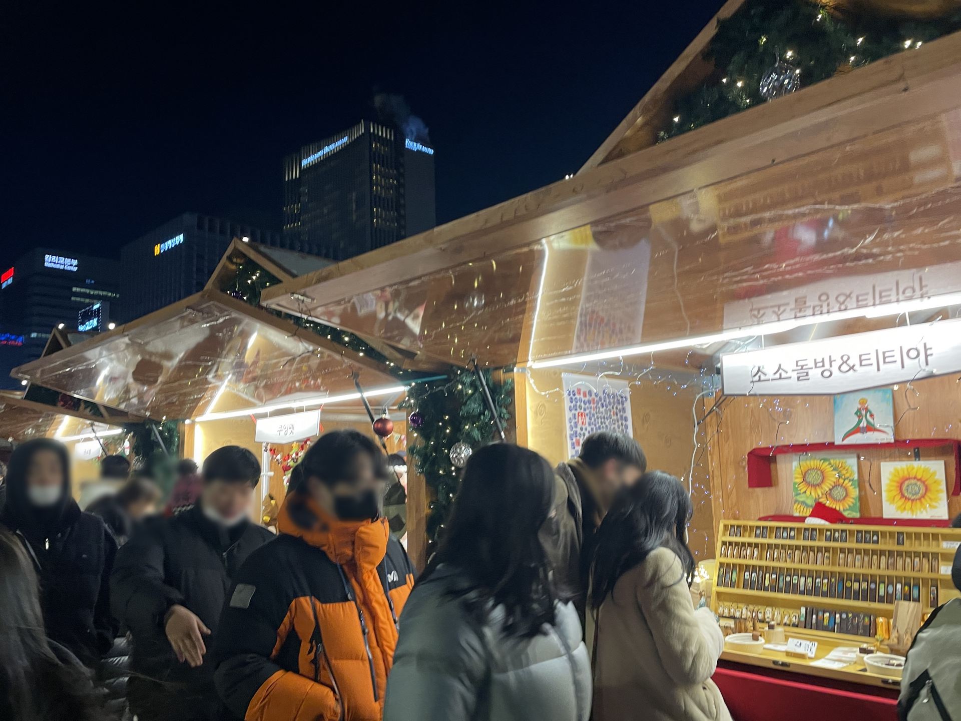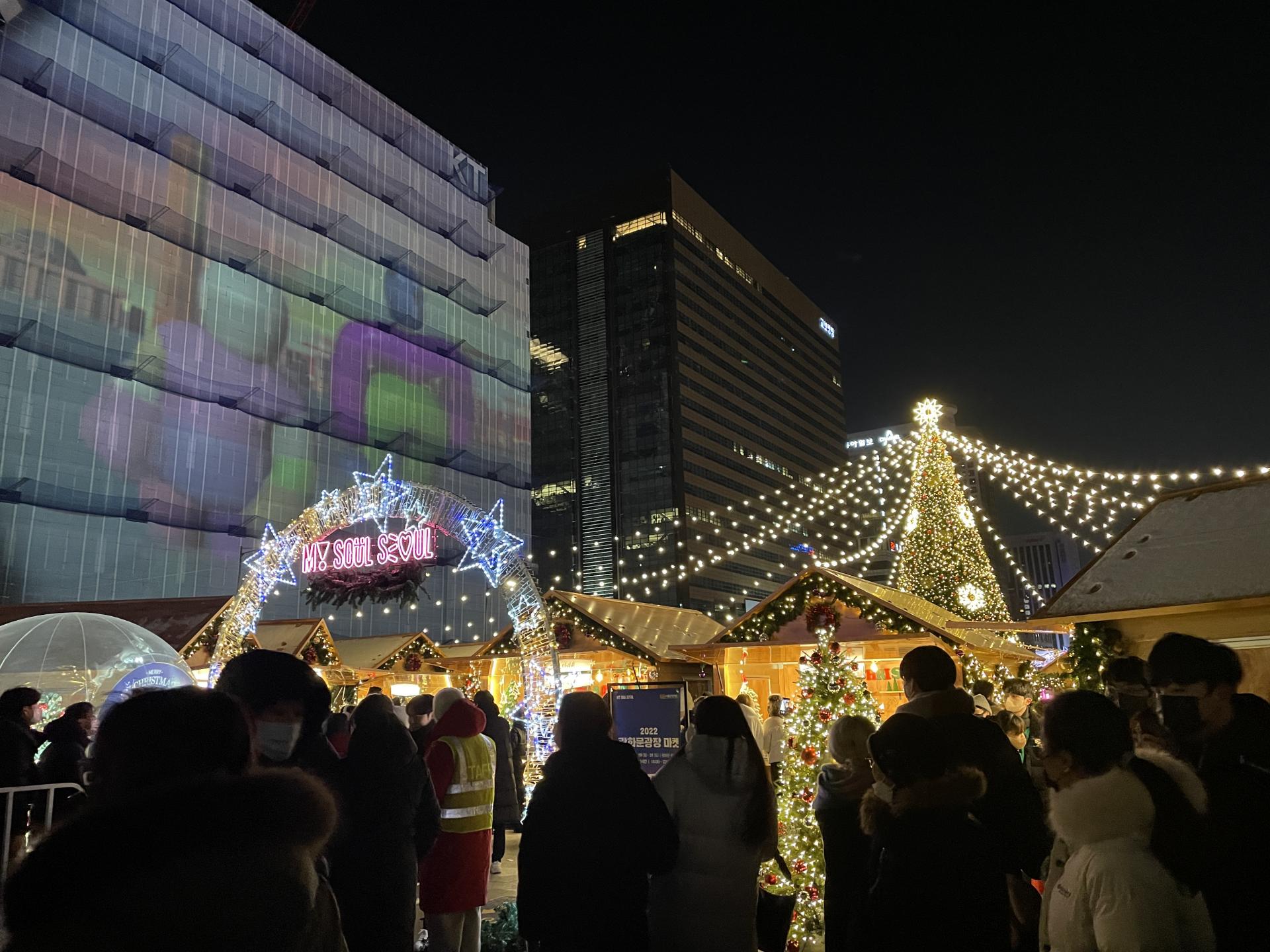 一番の人気スポットは光化門広場マーケットでクリスマスマーケットになっていました。私が行った日はクリスマスイブだったので、大混雑。入場制限となり、大行列で入るのを断念しました。外からはこのように少し覗くことができます。