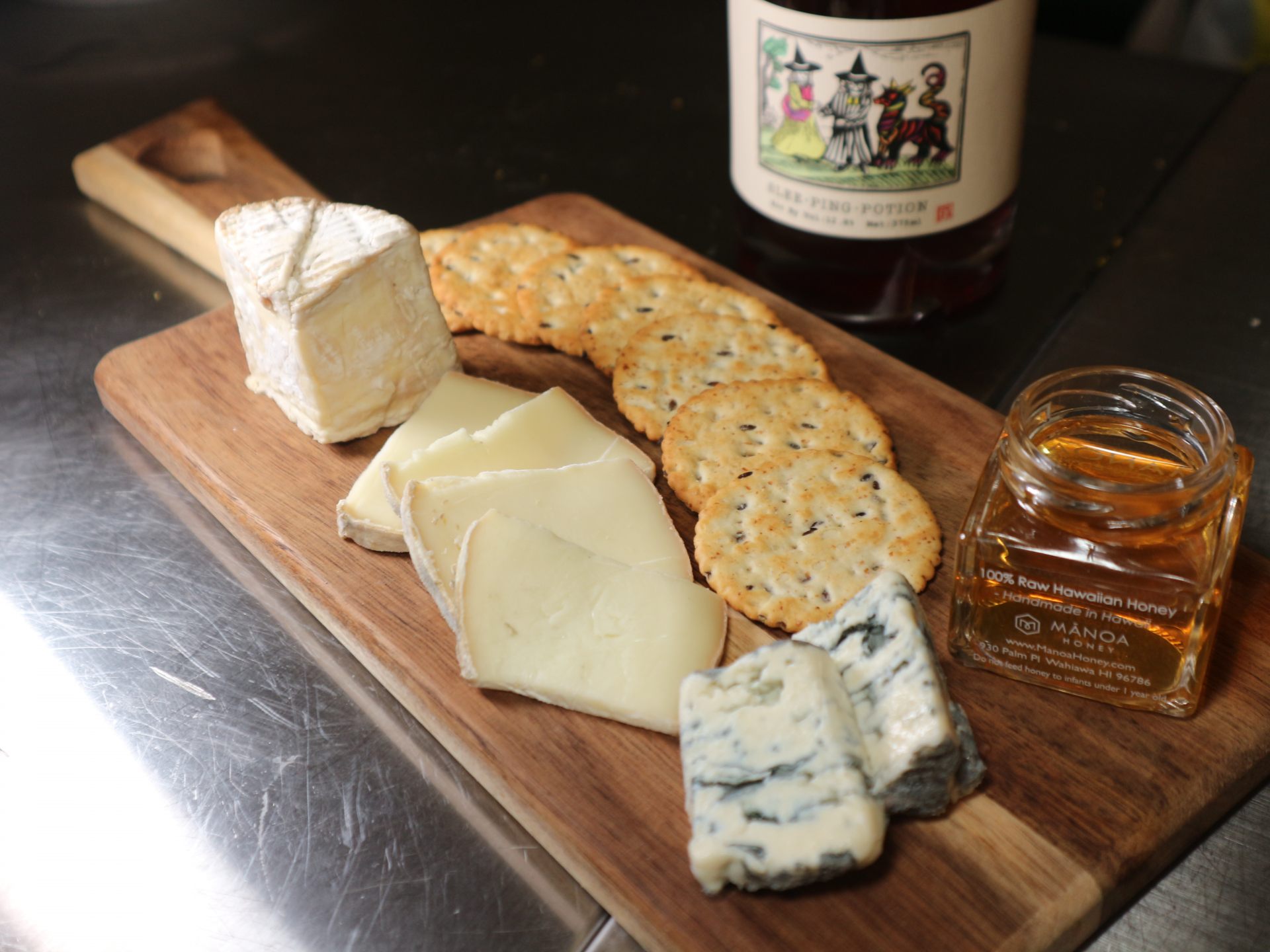 お食事の後には、デザートの代わりにチーズプレート。オアフ島中心部のワヒアワのマノアハニー&ミードの蜂蜜と一緒に。