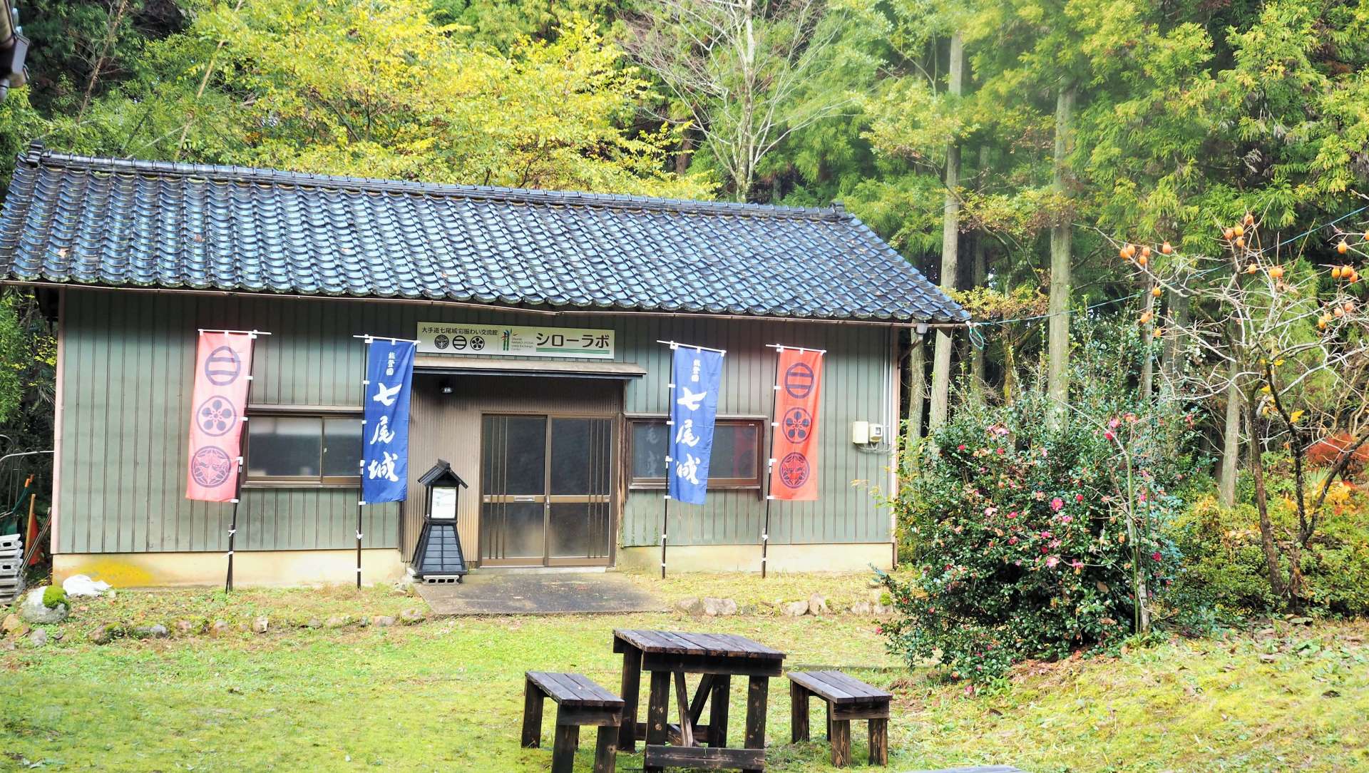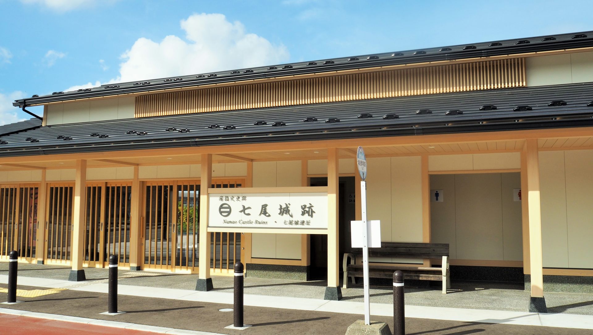 バスに乗り約30分ほどで「城史資料館前」のバス停でおります。バス亭は城史資料館の駐車場にあり、真新しい待合所とトイレがありました。待合所の中には、七尾城に登るための詳しい地図や飲み物の自動販売機などもあったので、ぜひ立ち寄っていただきたいと思います。