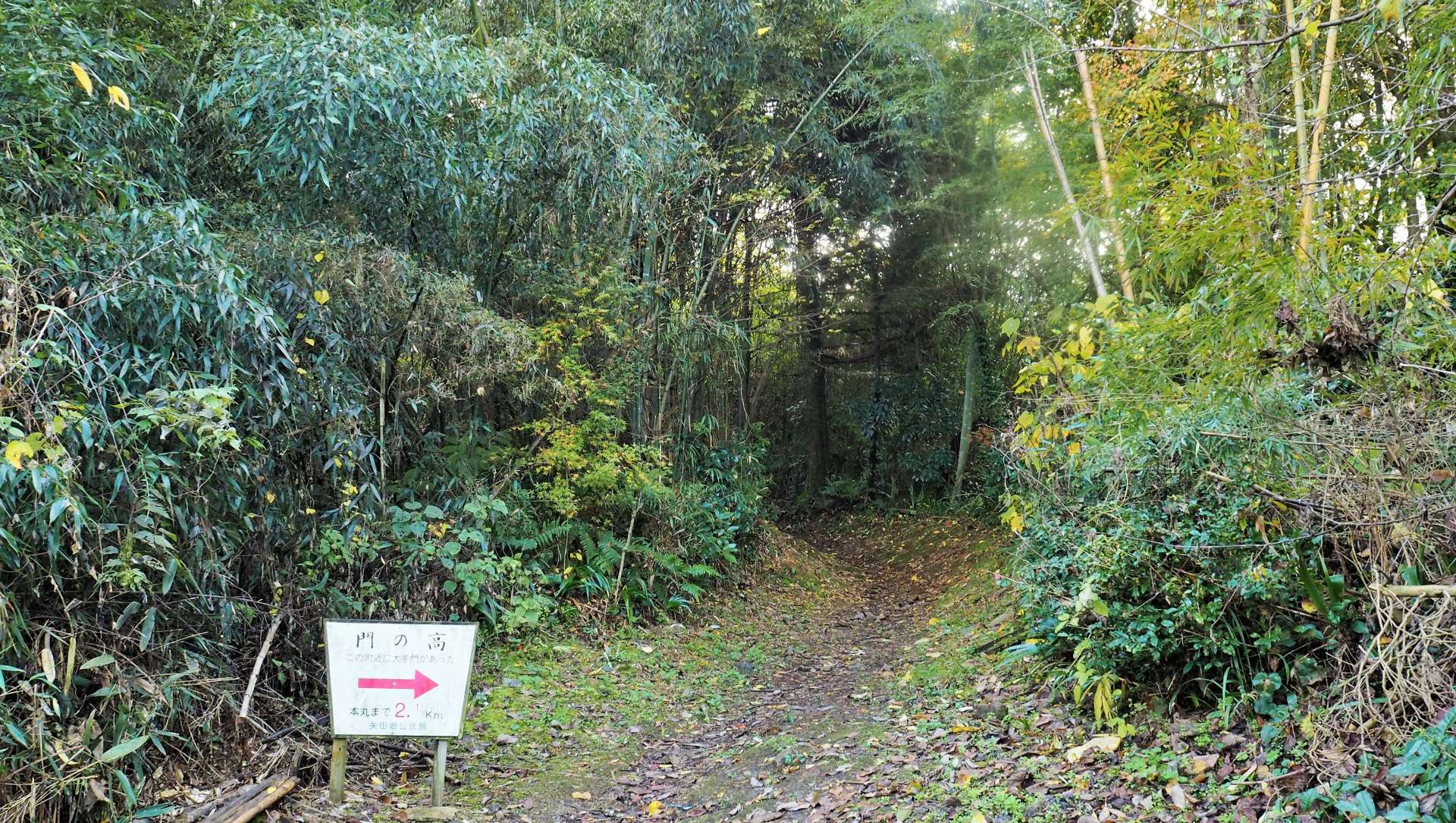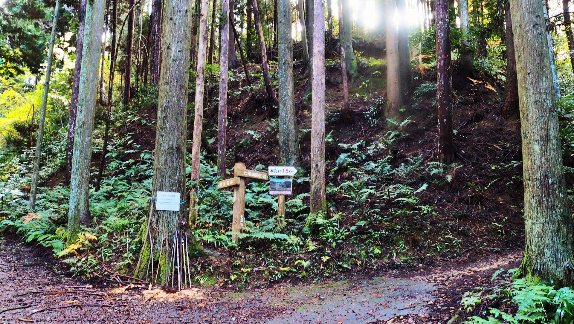 資料館から1時間ほど歩いたところで、分かれ道にやって来ました。どちらの道も七尾城に行けますが、三の丸、二の丸などの遺構を通る右の道を選びました。本丸まであと1.5㌔です。