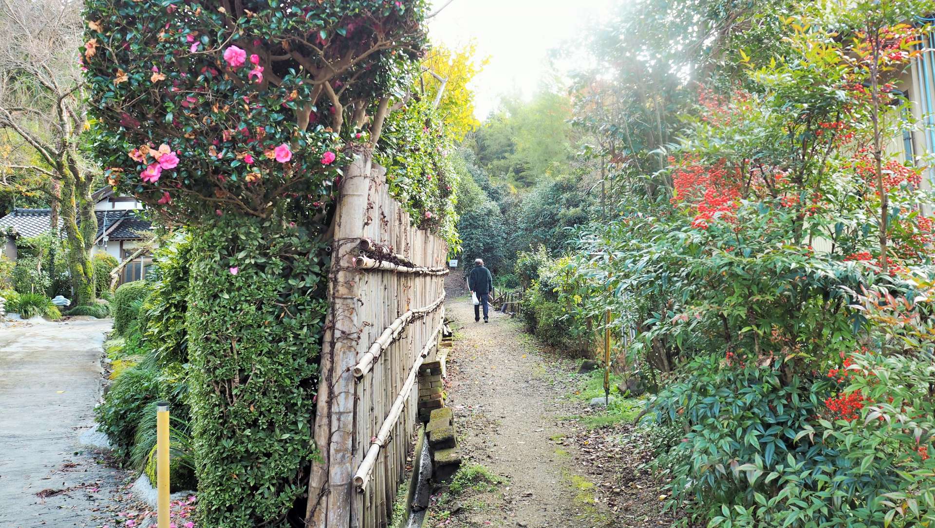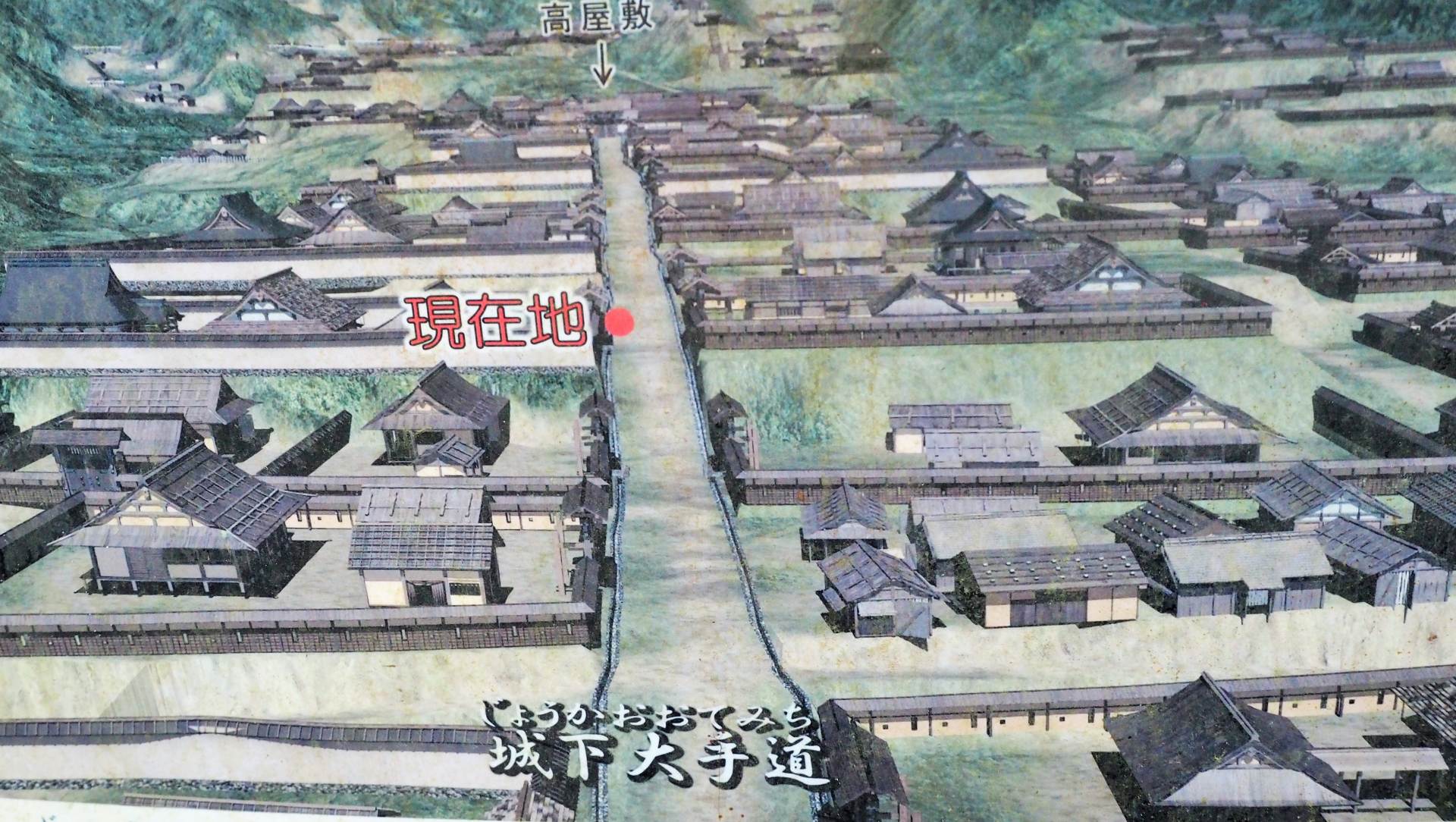 広い直線の道に出ました。この道は「大手城下道」と呼ばれています。先の道が狭まっていますが、当時は幅が3㍍で路面には小砂利が敷き詰められ、両側には石積みの側溝が敷設されていたそうです。