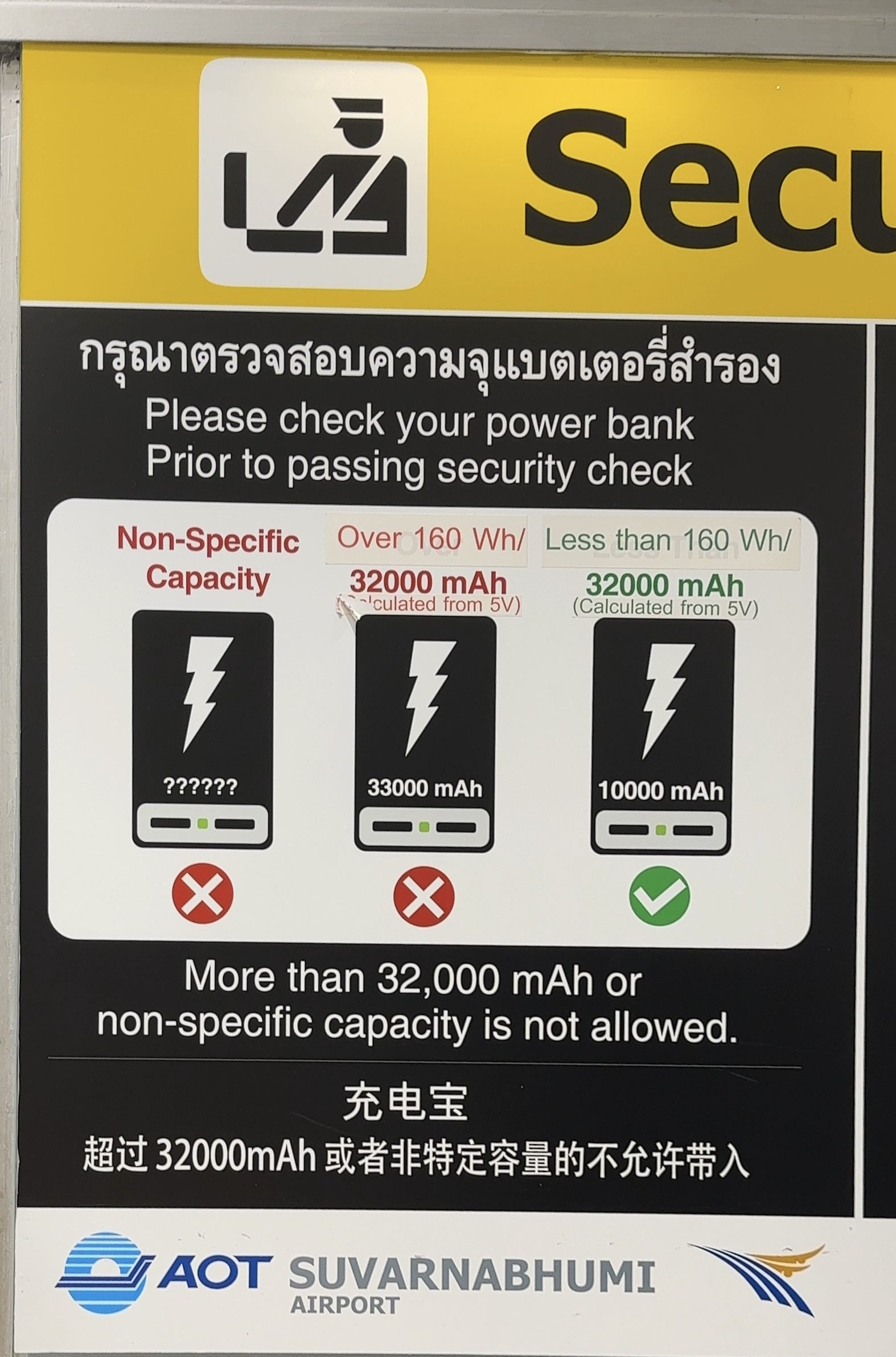 今回、バンコク空港のセキュリティの検査で、思いもしなかったですが、モバイルバッテリーを没収されていまいました。理由は、「バッテリー容量の記述が擦れて判読できないから」と言うもの。サイズ的に大容量で無いのが明らかなのにガンとして受け付けてくれなかったです。こんなの初めてです。気をつけてください。