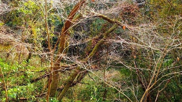 滝は中国自然歩道沿いにあり、冬でも鬱蒼とした木立に囲まれていました。周りには民家もなく、神話の世界観が漂います。看板の表示を確認しながら滝山川へ降りて行きます。