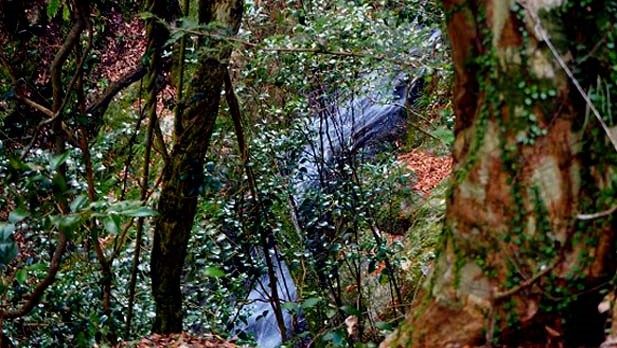 滝からあがり、中国自然遊歩道を歩いて帰る途中、木々の梢に阻まれてあまりよくは見えませんが、下に滝が見えました。流れ落ちる角度と遊歩道の高さから、もしかしたら、この滝が上の段の滝かもしれません。