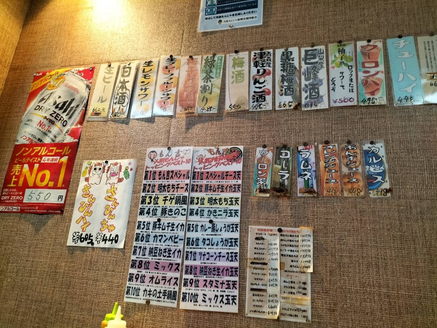 同じ通りに複数軒出店するチェーン店もあり、明るくきれいな店内に「元祖!」などと書かれたバナーを見るとついつい入りたくなってしまいますが、最終的にはいかにも昔からありそうな「(もん吉 西仲店)」に決めました。