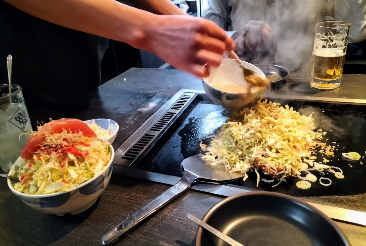 イギリスにはない納豆が恋しかったので、同店人気度7位の納豆ねぎ生イカと、”月島もんじゃといえば“の第2位、明太もちチーズのもんじゃを頼みました。