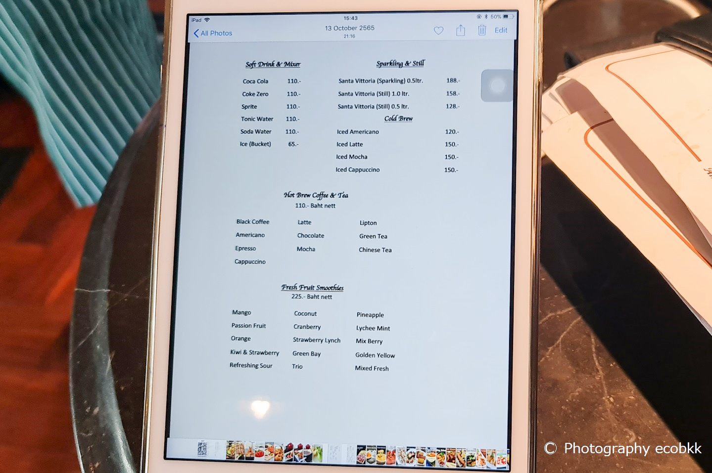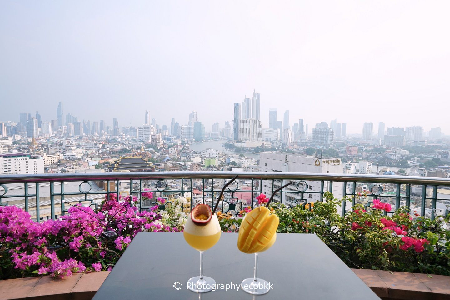 チャオプラヤー川や旧市街の街並みや観光スポットを眺めながら、大変お洒落に提供されて、しかも、おいしいドリンクで、大満足でした。友だちが注文した右のマンゴースムージーについているマンゴーもとてもおいしかったそうです。カクテルを頼んだ方も大変おいしかったと話していますよ。