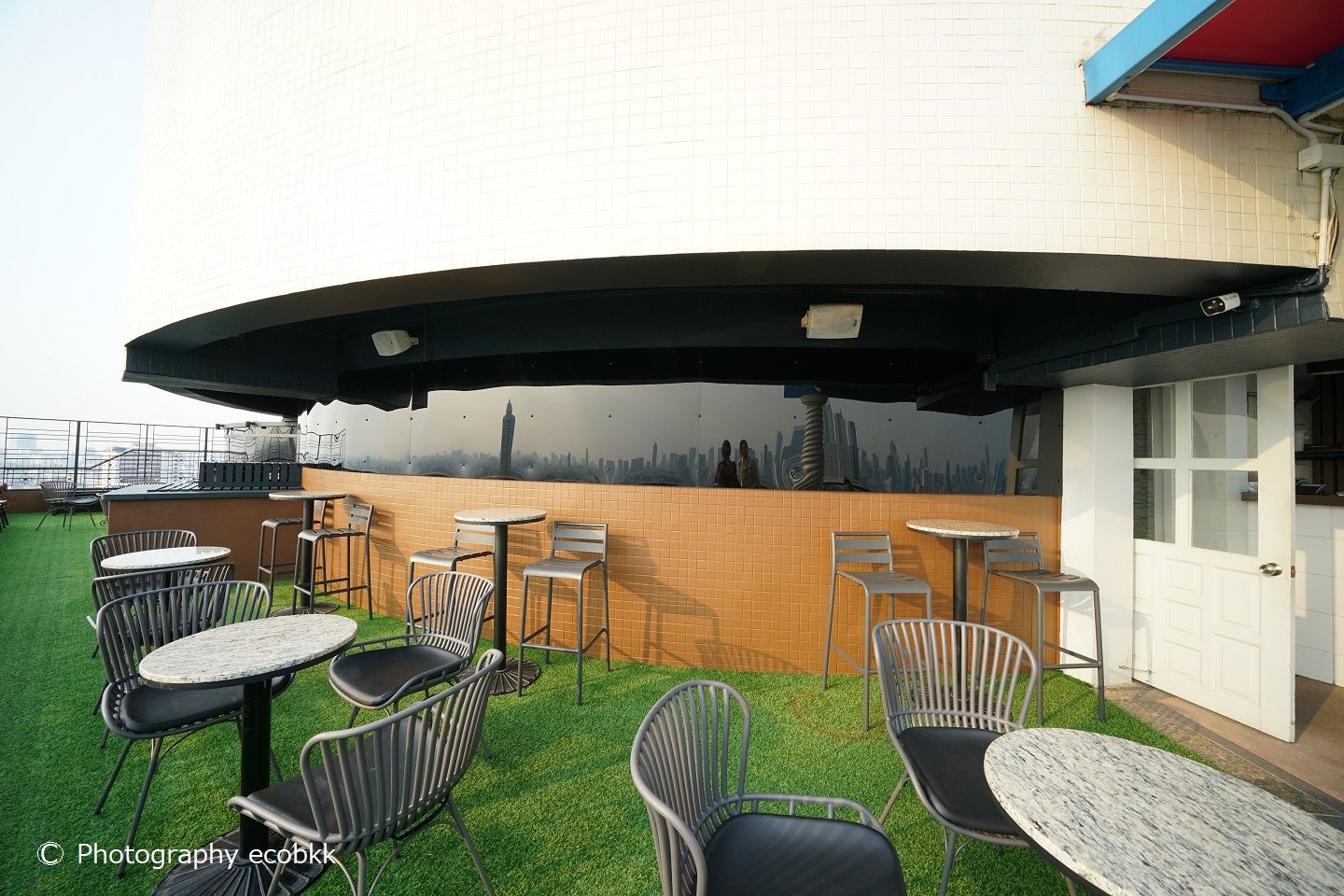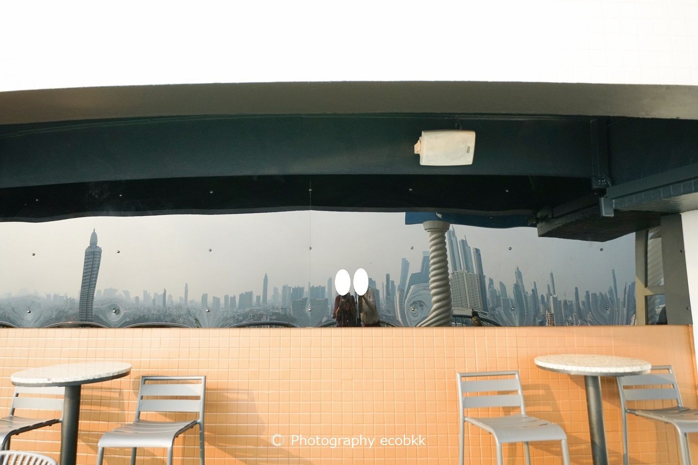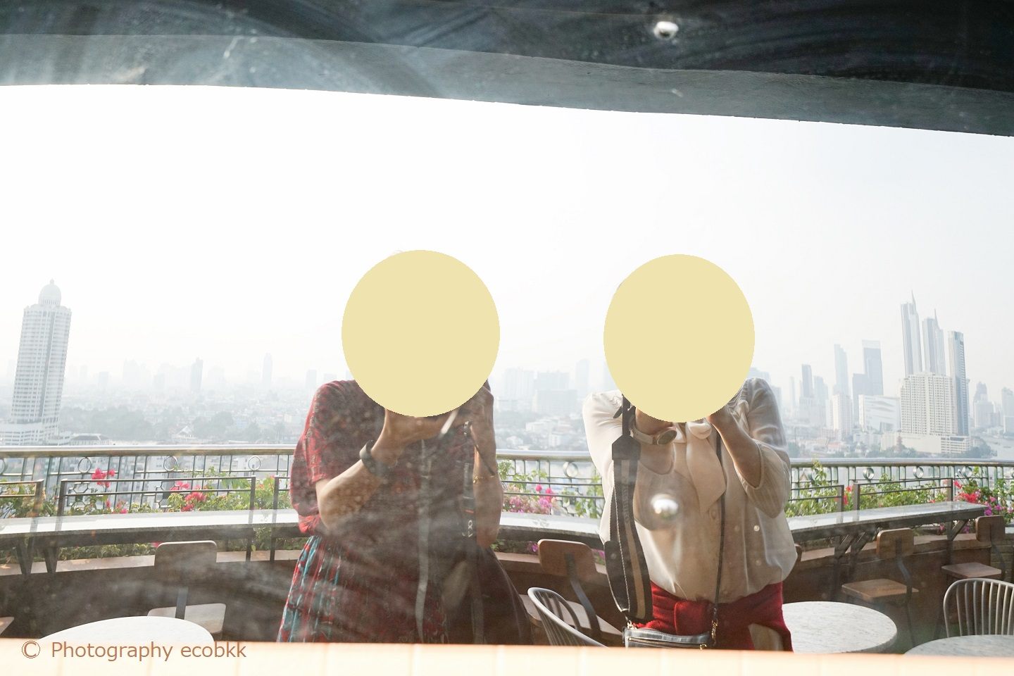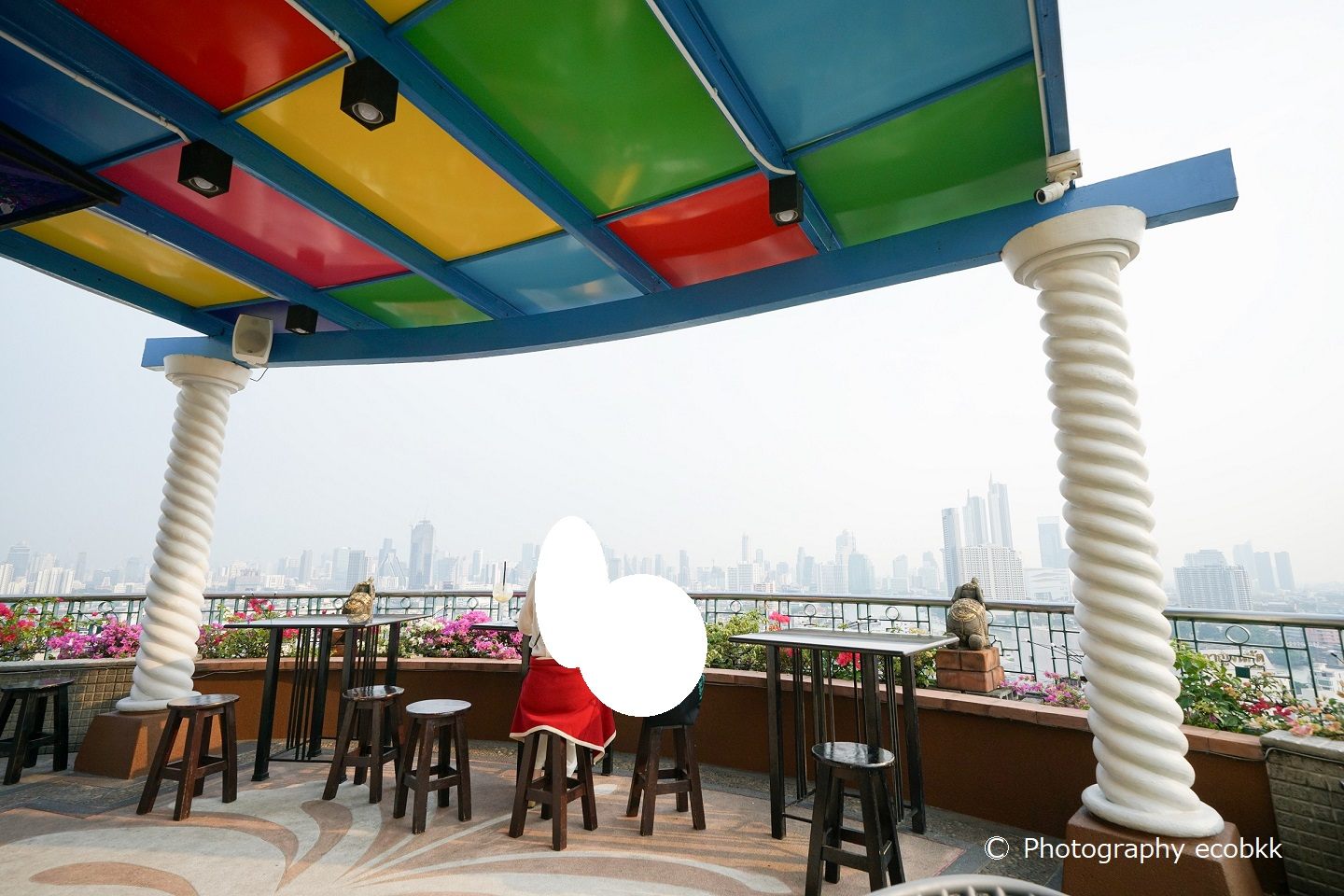 ホテル宿泊者は15時~、一般の来客者は17時~利用できる23階のバー「RIVER VIEW BAR(リバービューバー)」へは、25階から階段での移動になります。この日は、広角レンズを付けたカメラしか持っておらず、引き気味の写真しか撮れず、各観光スポットも小さくしか撮れませんでしたが、目の前に窓ガラスのない風景は、絶景の眺めでした!私たちが訪問時、この階には、ホテルの従業員というよりは、プールの監視員のような、短パン姿の男性スタッフが一人いました。