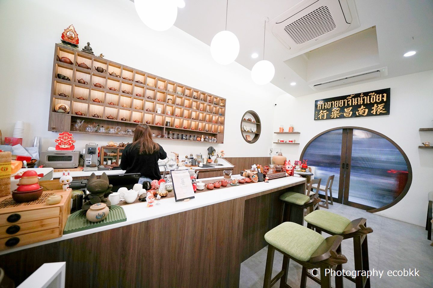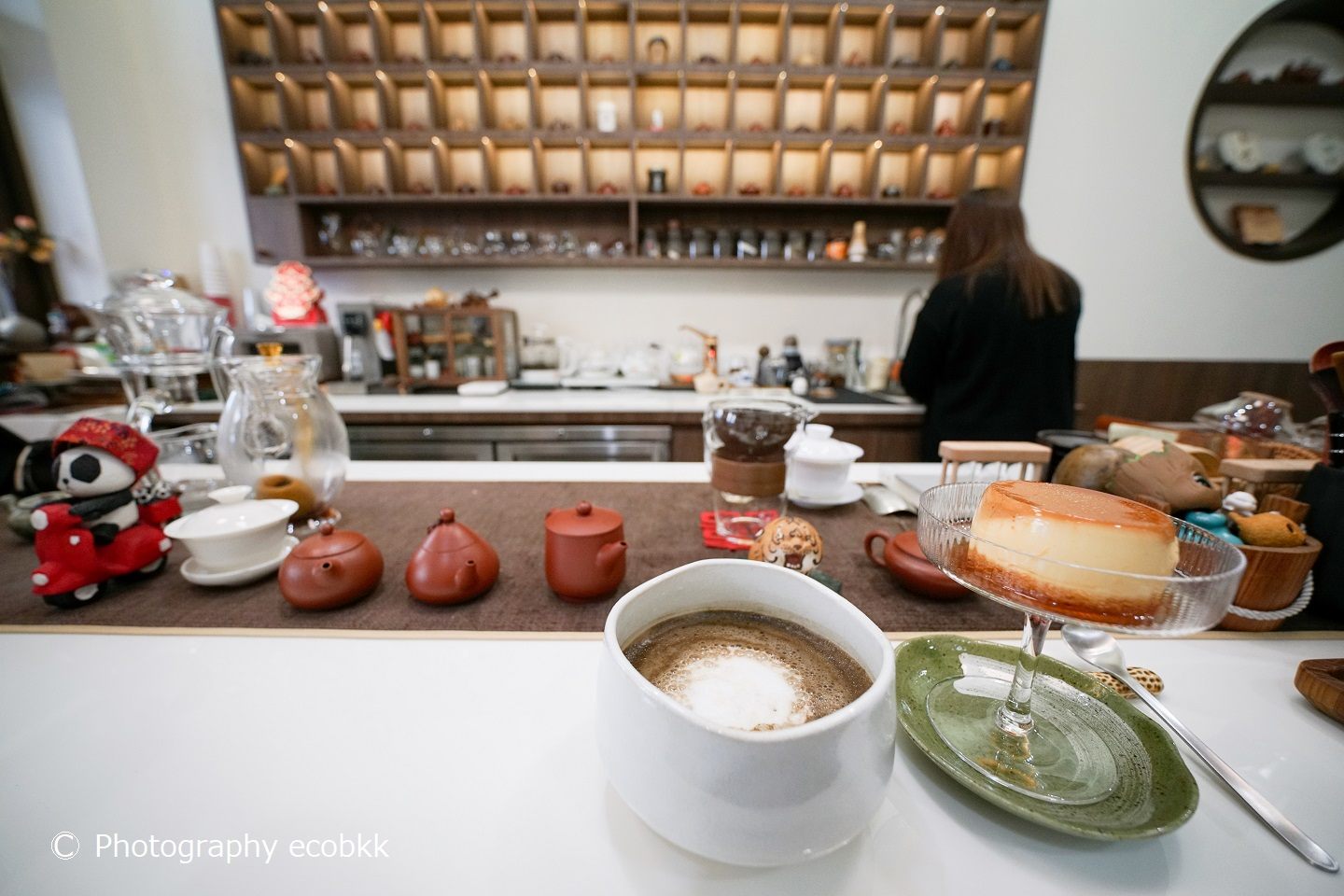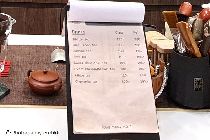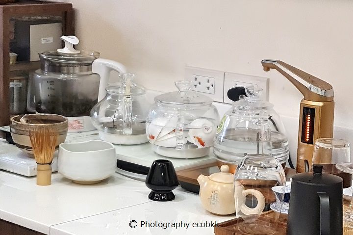 まず、こだわりを感じたのは、店内の様子。バンコクの中心街でも手に入らなさそうなものがずらりと並んでいたので、スタッフの方に、思わず、「タイ人ですか?」とたずねたほど。その日、もてなしてくれたのは、タイ人でしたが、目の前にあった白い茶器は台湾、お湯を沸かしている調理器具は中国のものとのこと。