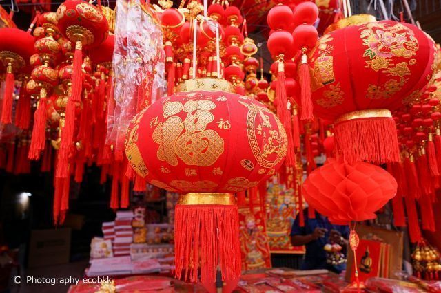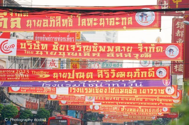 春節前の1月12日にも、タイ・バンコクの中華街(ヤワラート)へ訪問していますが、既に街中には赤い飾りものやチャイナドレス、春節らしい果物などがたくさん販売されていました。中華街で、パワースポットや厄払い目的で参拝する方が多いことで知られる寺院「ワット・マンコン・カマラワート (龍蓮寺)」内にも赤く飾られ、大変美しかったです。数年前は本堂に写真撮影禁止の表示がありましたが、今回なくなっており、本堂のすぐそばには、撮影用の座席等まで用意されており、時代の流れを感じました。