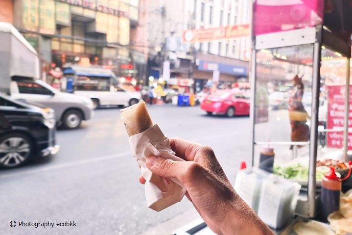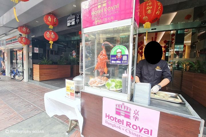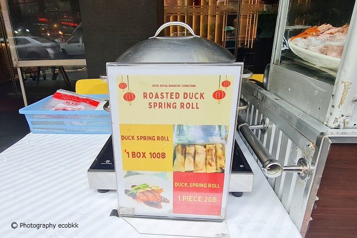 ホテルロイヤルバンコク@チャイナタウンの前は16時半頃と18時頃通りましたが、両時間帯共に、ローストダック・スプリングロールの屋台(1本20B、5本入1パック100B)も出ていました(以前、正午位に通った時は屋台は出ておらず。夕方~の営業のようです)。北京ダックが食べられると日本人の間で噂の屋台ですが、ローストダックの皮はパリッとはしておらず、身があるという感じのもので、今まで食べたことのある北京ダックとは違う感じがしましたが、なかなかおいしかったです。