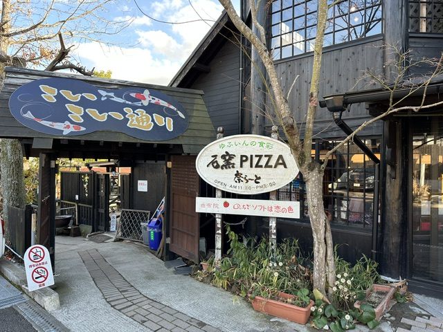 金鱗湖への近道にもなるという「こいこい通り」には、石窯焼きのピザレストランと土産物屋がありますが、ユニークなのは中庭の「のいちごガーデン」です。