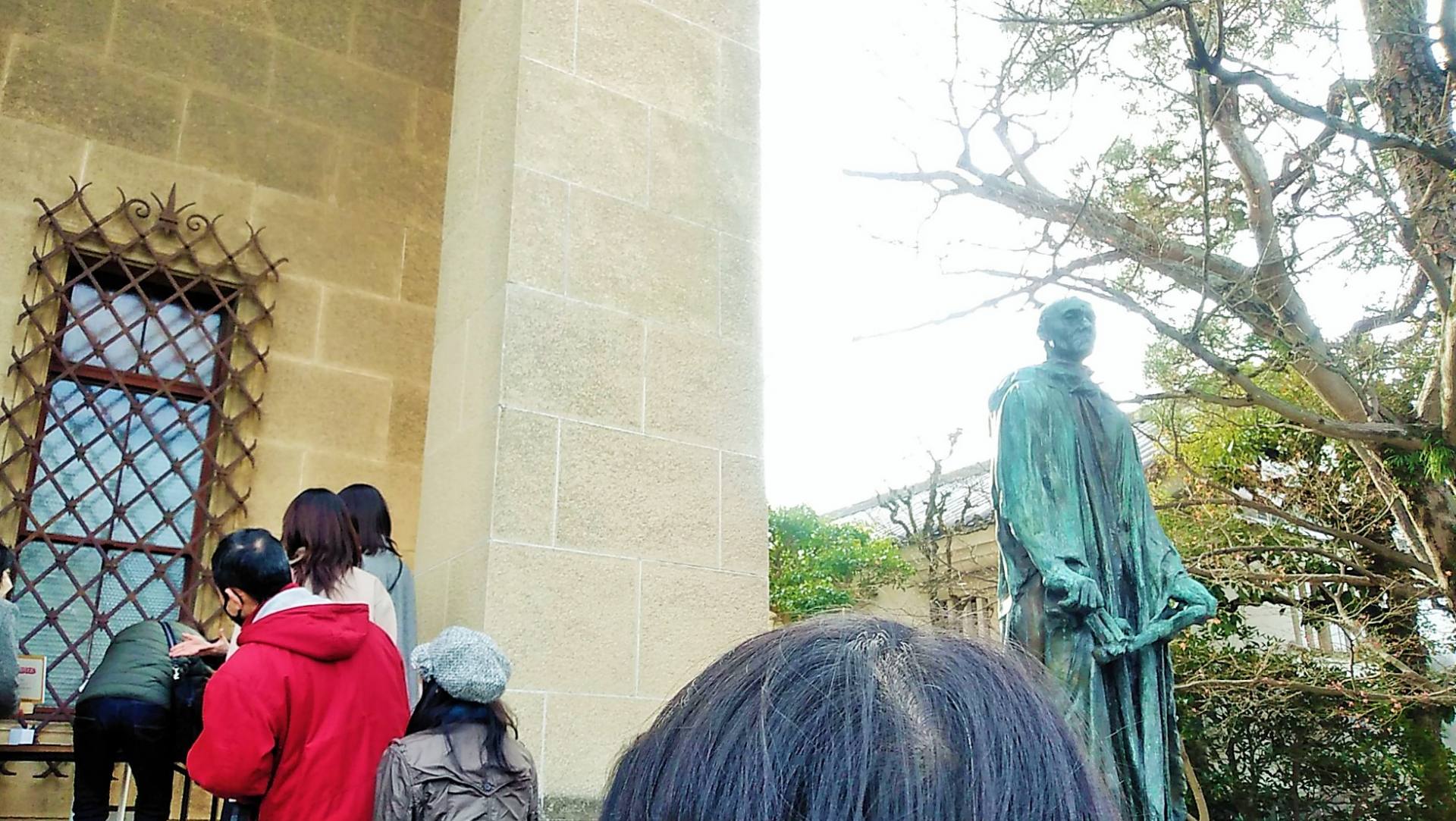 お目当ては大原美術館ですが門をくぐると10人くらいの行列ができていました。受付で住所の県名と年齢を記入したら入場できました。この日は開館前から約80人が列を作っていたそうです。
