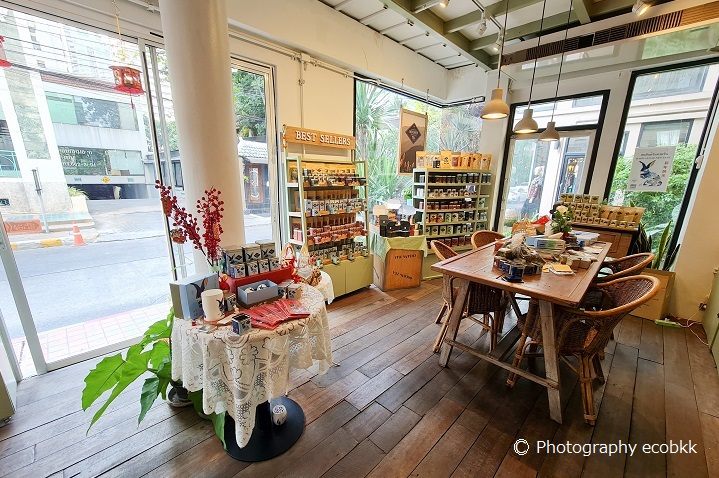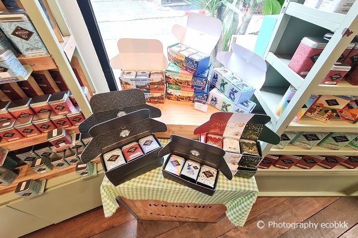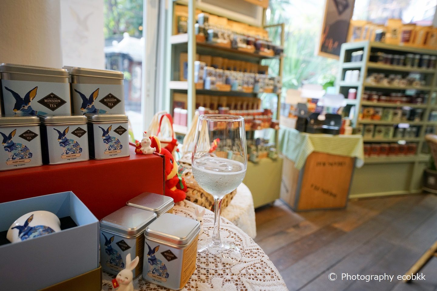 今回は、ウサギのラベルが付いた茶葉入りの茶缶(150バーツ~)を購入しました。中に入っている茶葉はグリーンティーベースで、バタフライピーがブレンドされたもの。ドリンクの写真は、スタッフの方がさっと試飲用にグラスに入れてくれ、思わず、グイっと飲んでしまった後の写真で、ちょっと色が分かりにくくなってしまったのですが、ほんのり青いお茶で、すっきりとした飲みやすい味わいでした。