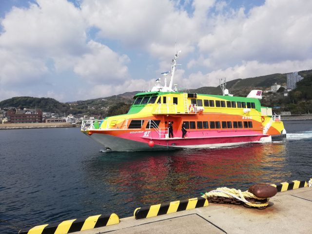 伊豆稲取駅から稲取港までは徒歩15分、タクシーで5分ぐらいです。乗船時間はたったの35分!なかなか乗る機会のないジェットホイルは揺れも少なく、快適です。