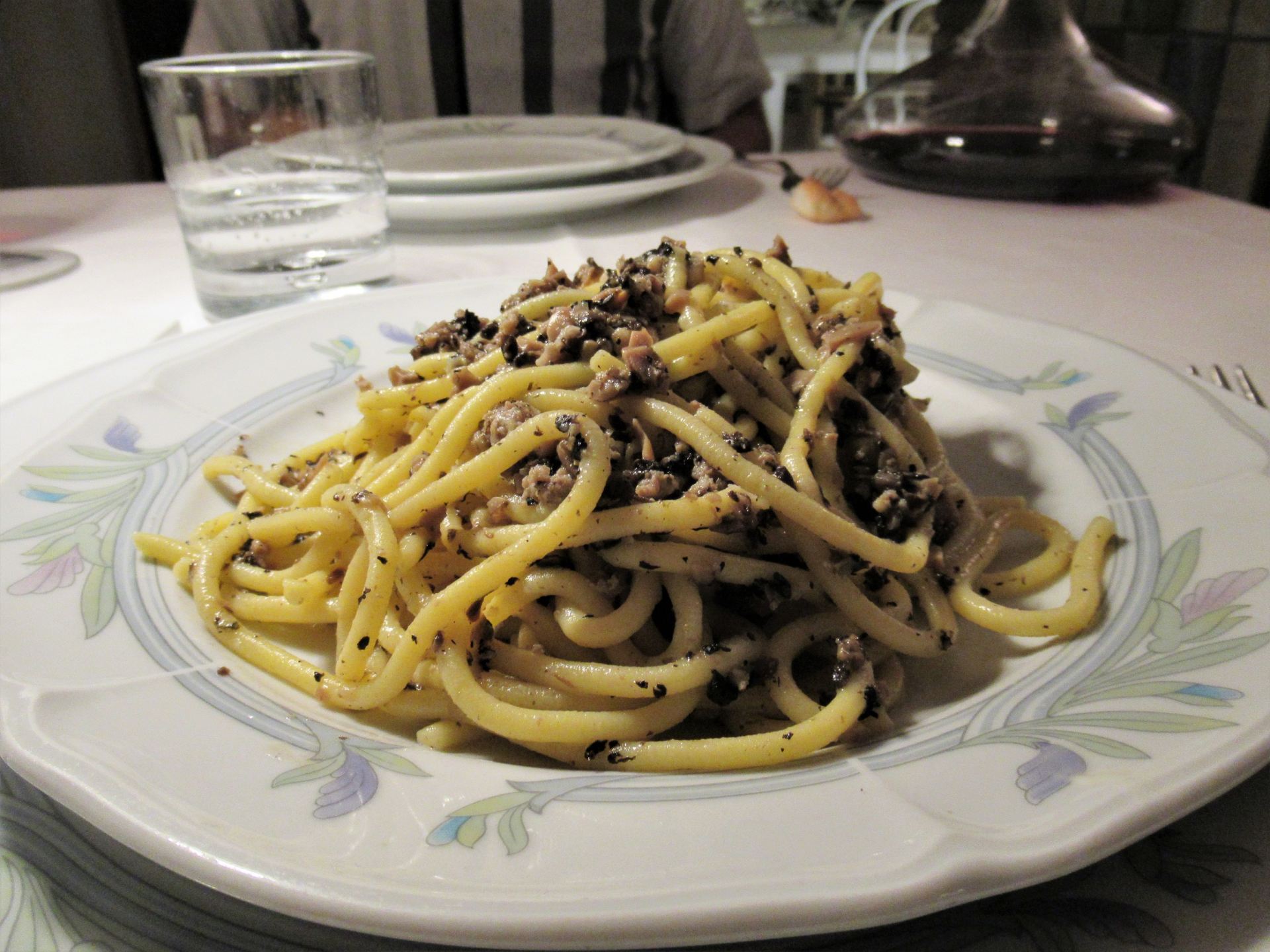 店の名前がついたきのこと豚肉の”Buca風スパゲッティ”は、ウンブリア州独特の太麺手打ちパスタ、ウンブリチェッリでした。田舎風というのでしょうか。なつかしい味わいで、ウンブリアの赤ワインによく合いました。