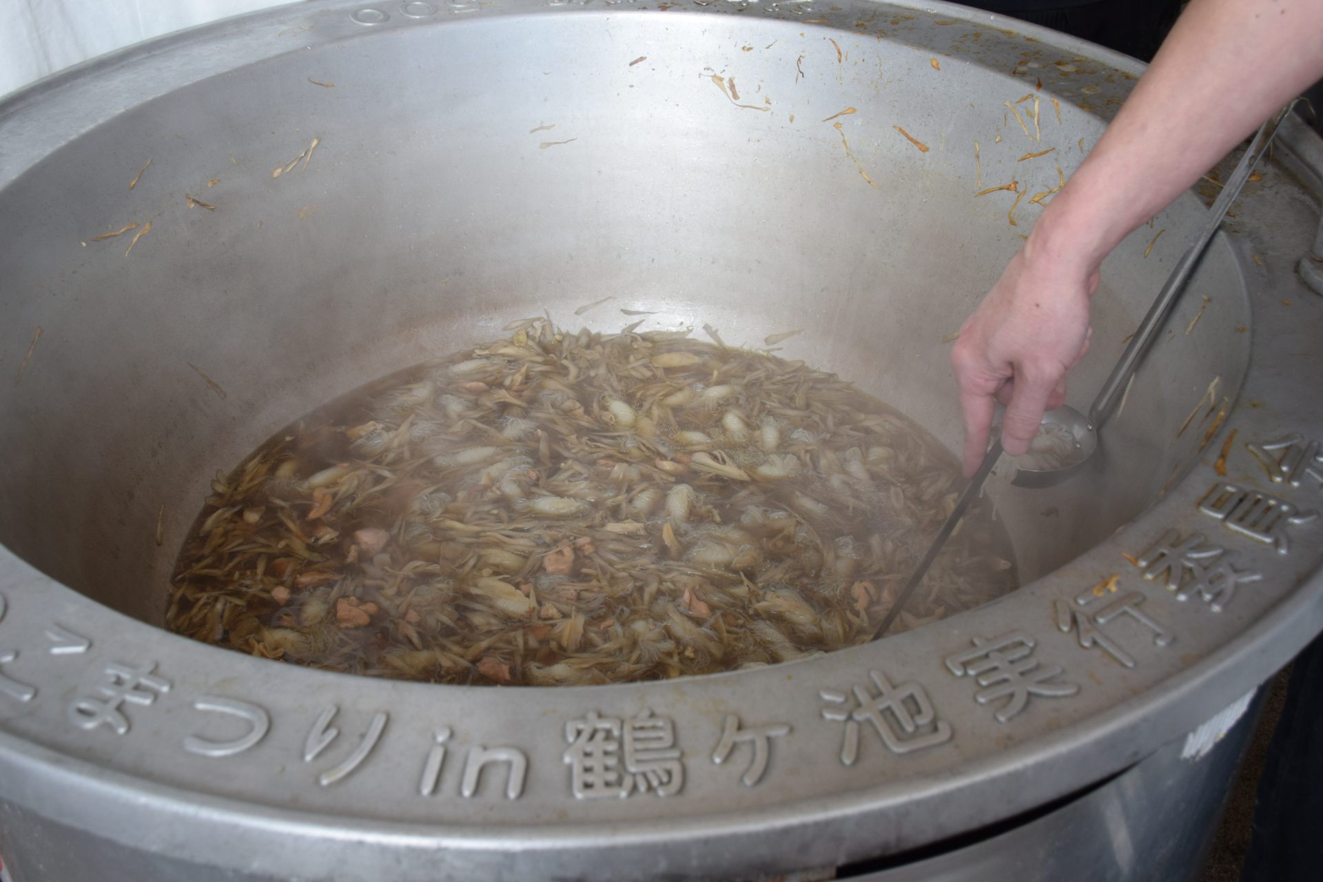 里いも・きのこ・鶏肉・野菜が入った横手市のいものこ汁が専用の大鍋で作られていました。