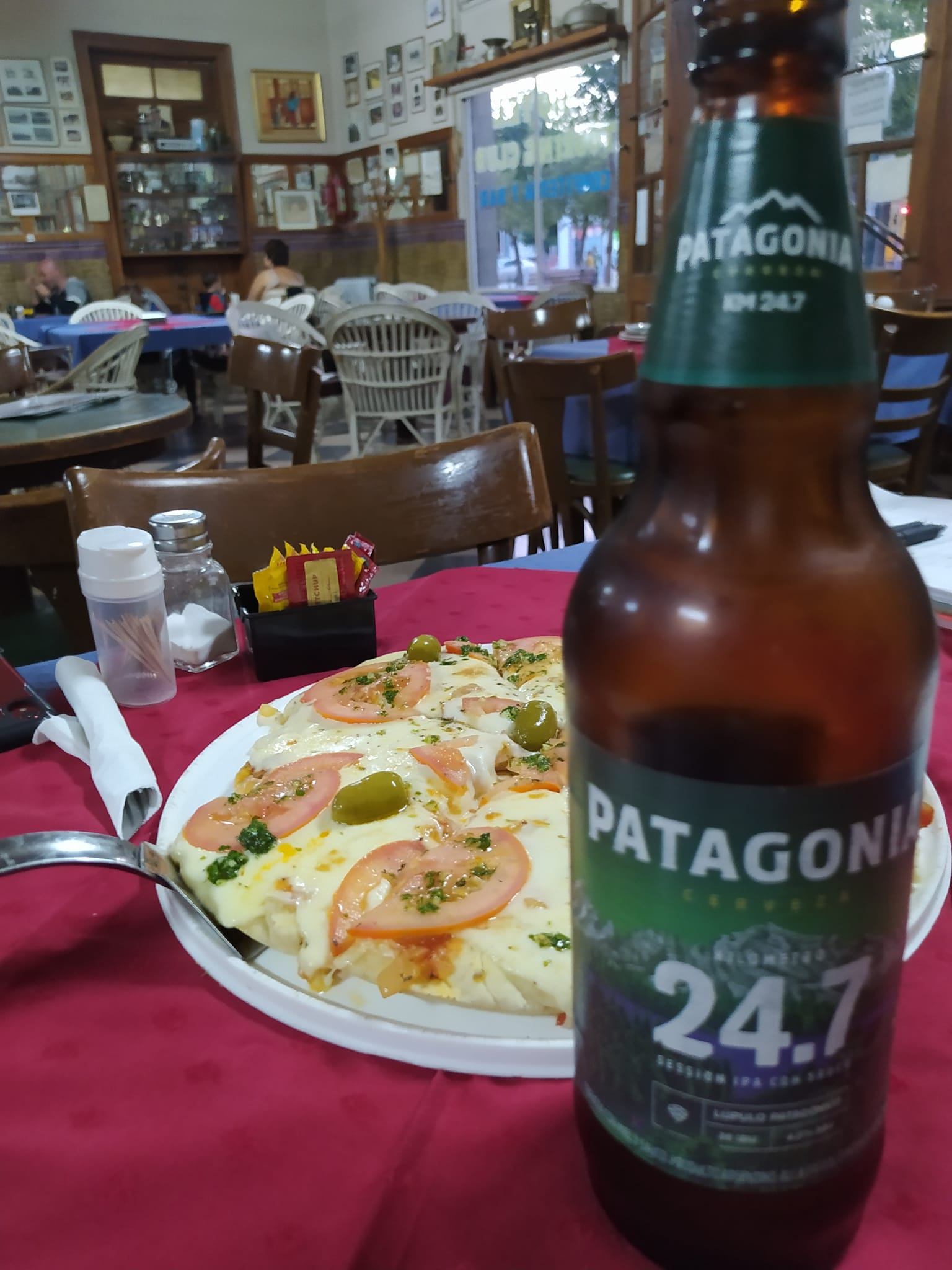一般に夕食が遅いアルゼンチンですからバルデス半島周遊後の早めの夕ご飯には、ここでそのまま軽食をいただくのが便利です。喫茶店の軽食ですが私達が選んだのはピザやおつまみのピカーダ、十分夕ご飯になります。ビールは近頃おいしいPATAGONIAです