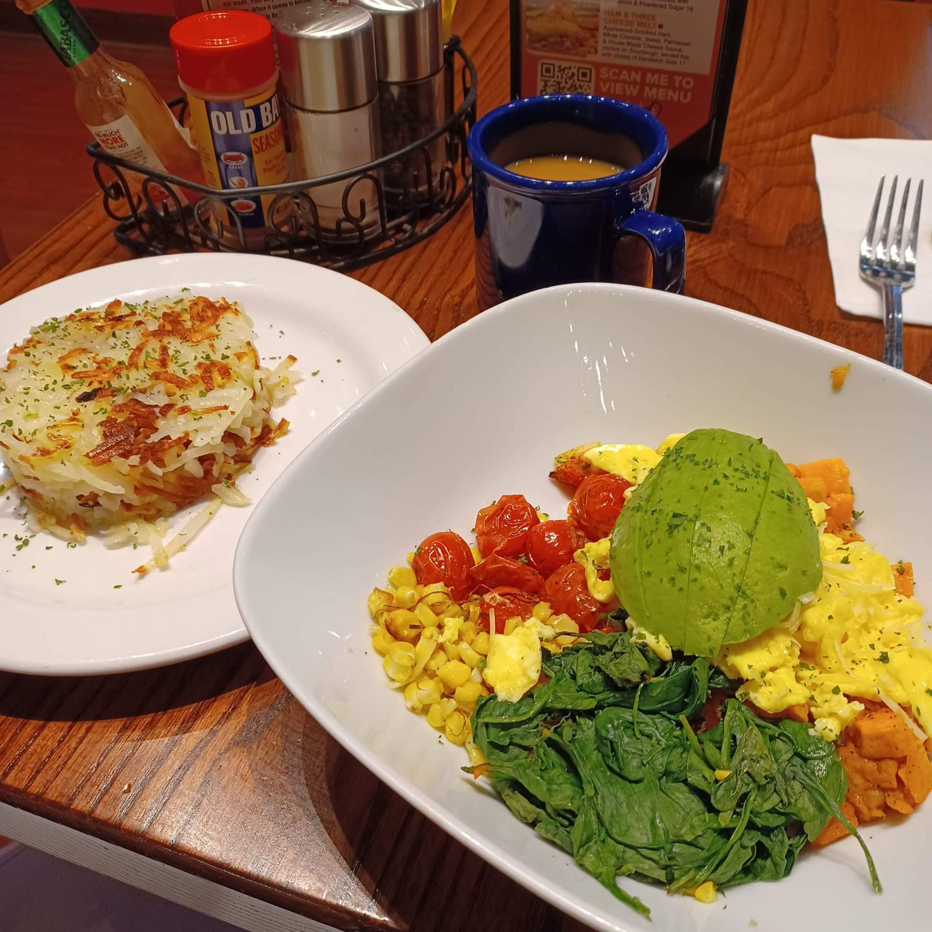ボルチモア・ブレックファスト・ボウルはベジタブルメニュー(※追加料金でソーセージの追加可能)ですが、グリルしたトマトやスイートコーン、スイートポテト、ホウレンソウ、玉ねぎのソテーなどが盛りだくさんに入っておりました。朝食メニューと言っても一皿ずつとてもボリュームがあります。ハッシュポテトはちょっと添えられている程度のものかと思っていたら、ハンバーグ大の大きさで来てびっくりしました。