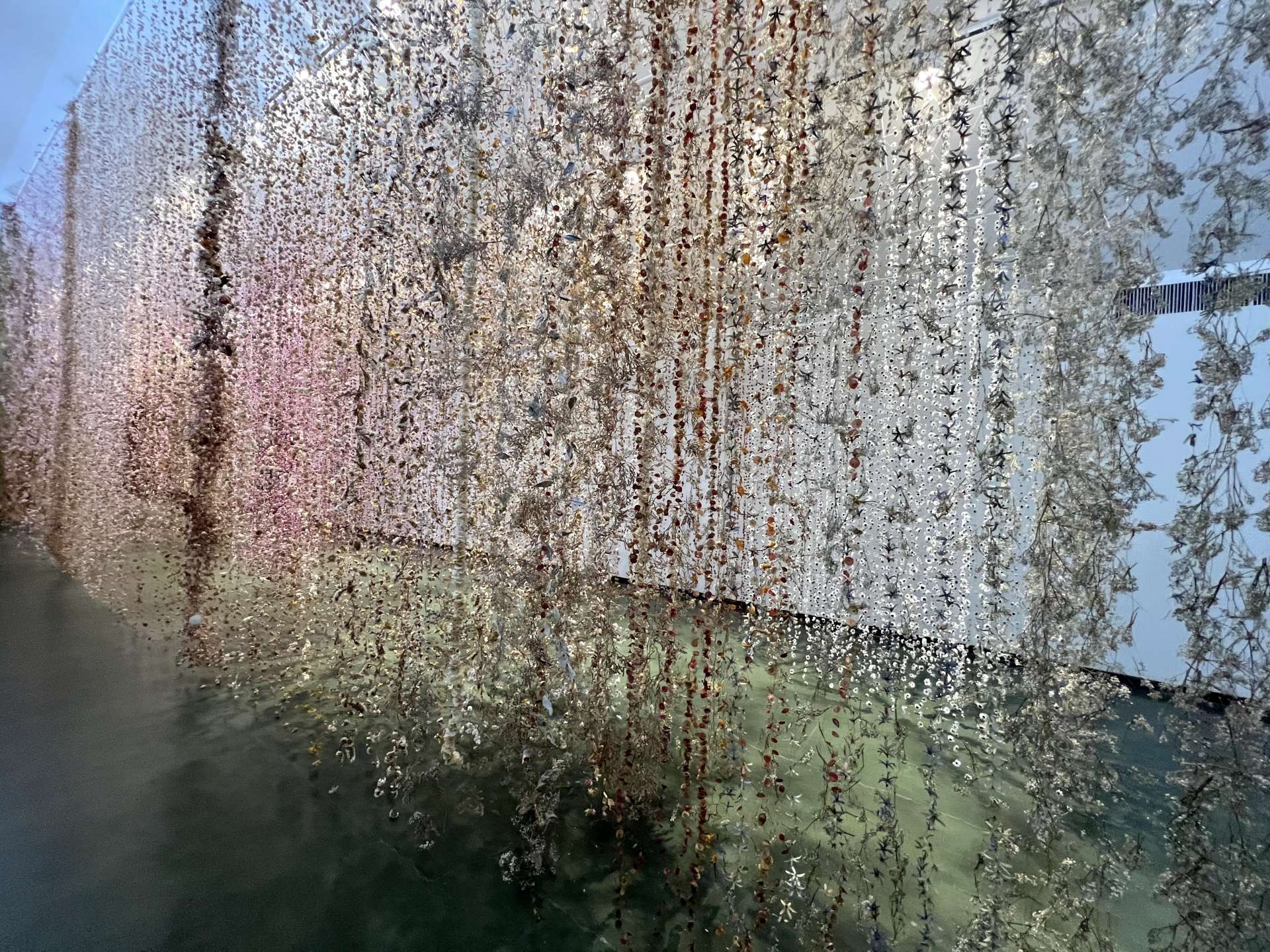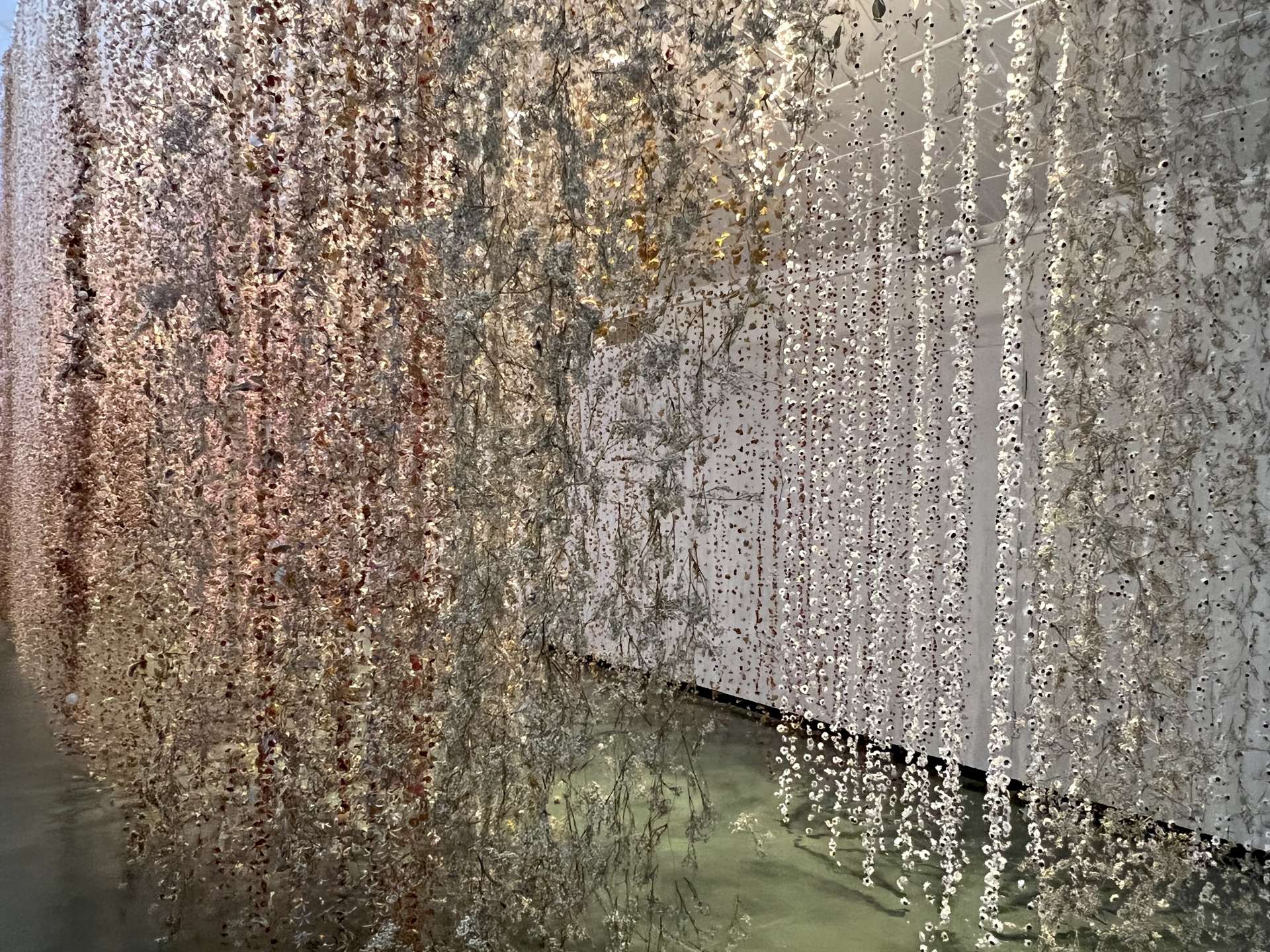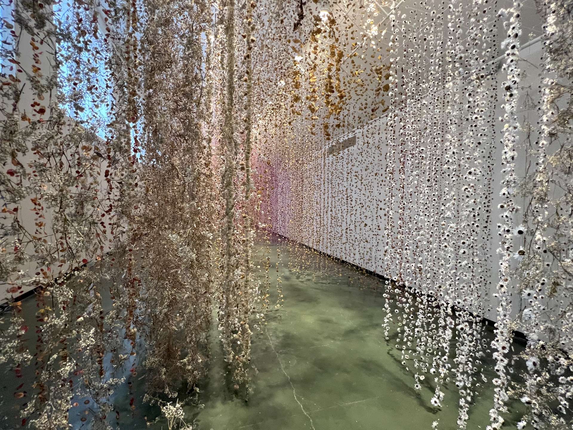 20年近くかけて収集した100万点以上の花や植物そして自然素材を銅線で天井から吊り下げたインスタレーションの中を歩くと、そこはまるで幻想的な異世界です。