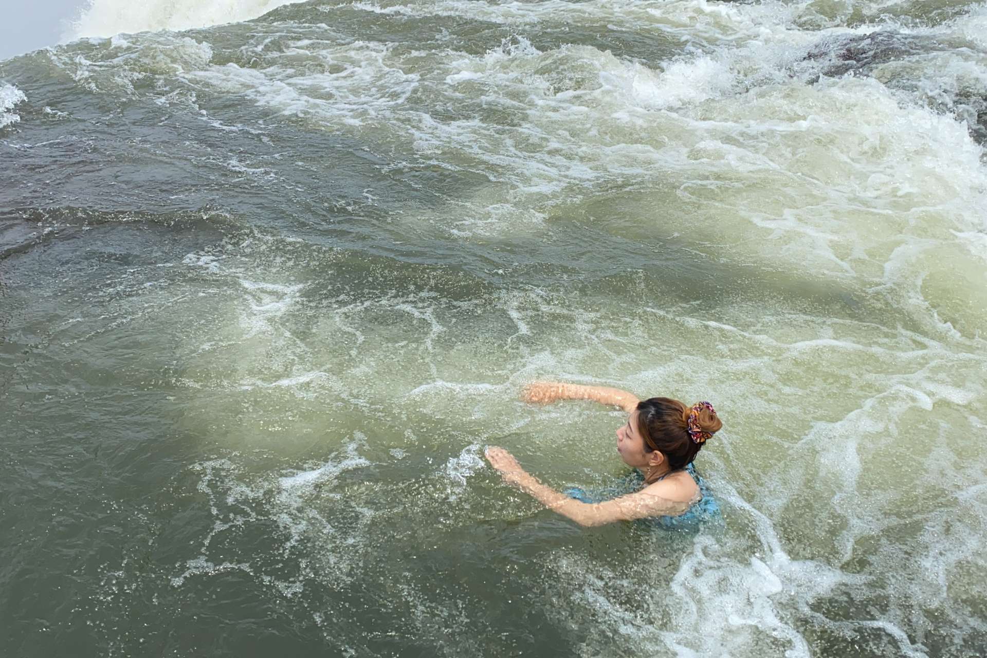 その後カメラはツアーガイドに預け、デビルズプールまでは急流の中を40mほど泳ぐ必要があります。
