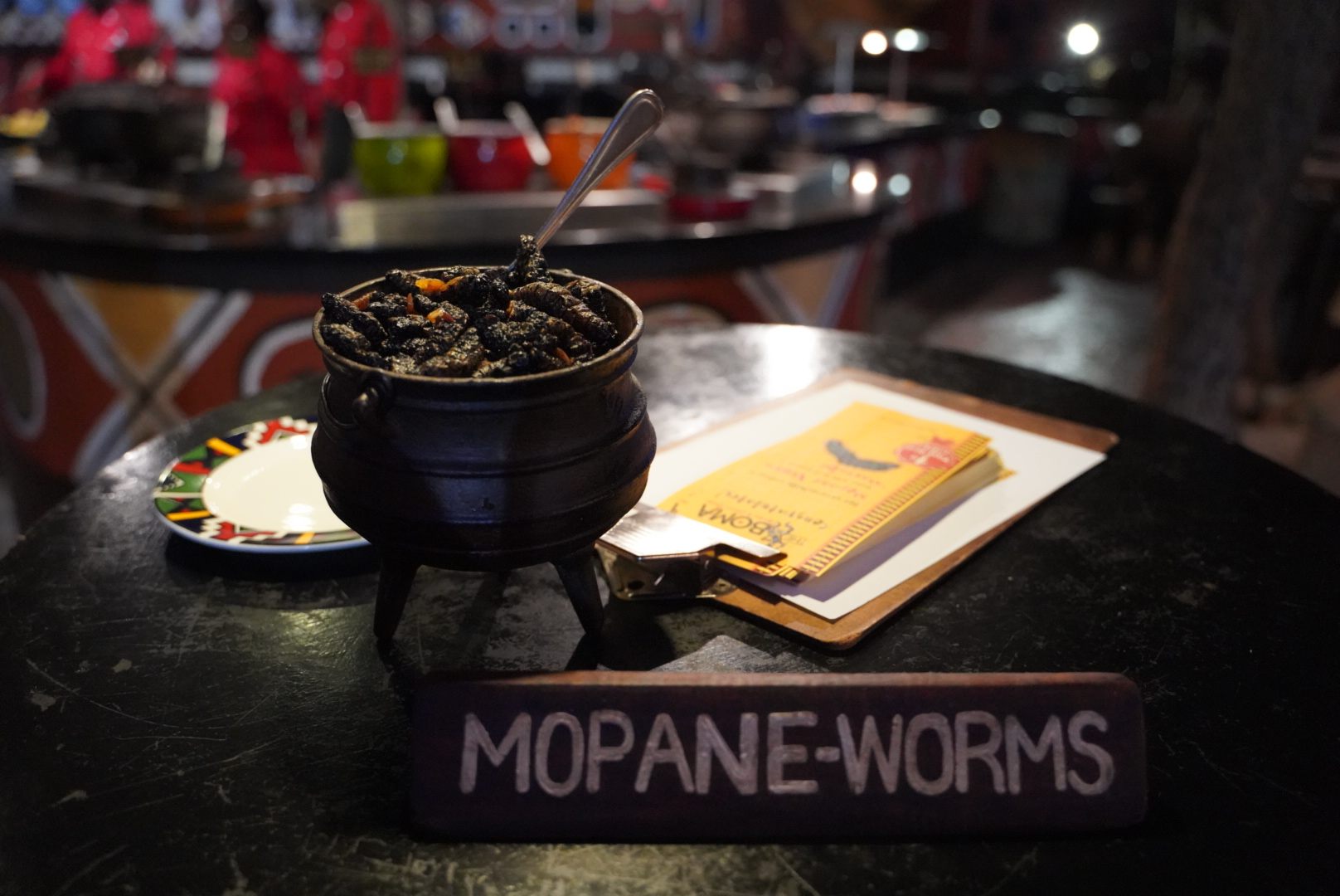ビュッフェの中には珍しいクドゥのステーキや、モパネワームと呼ばれる蛾の幼虫も・・・